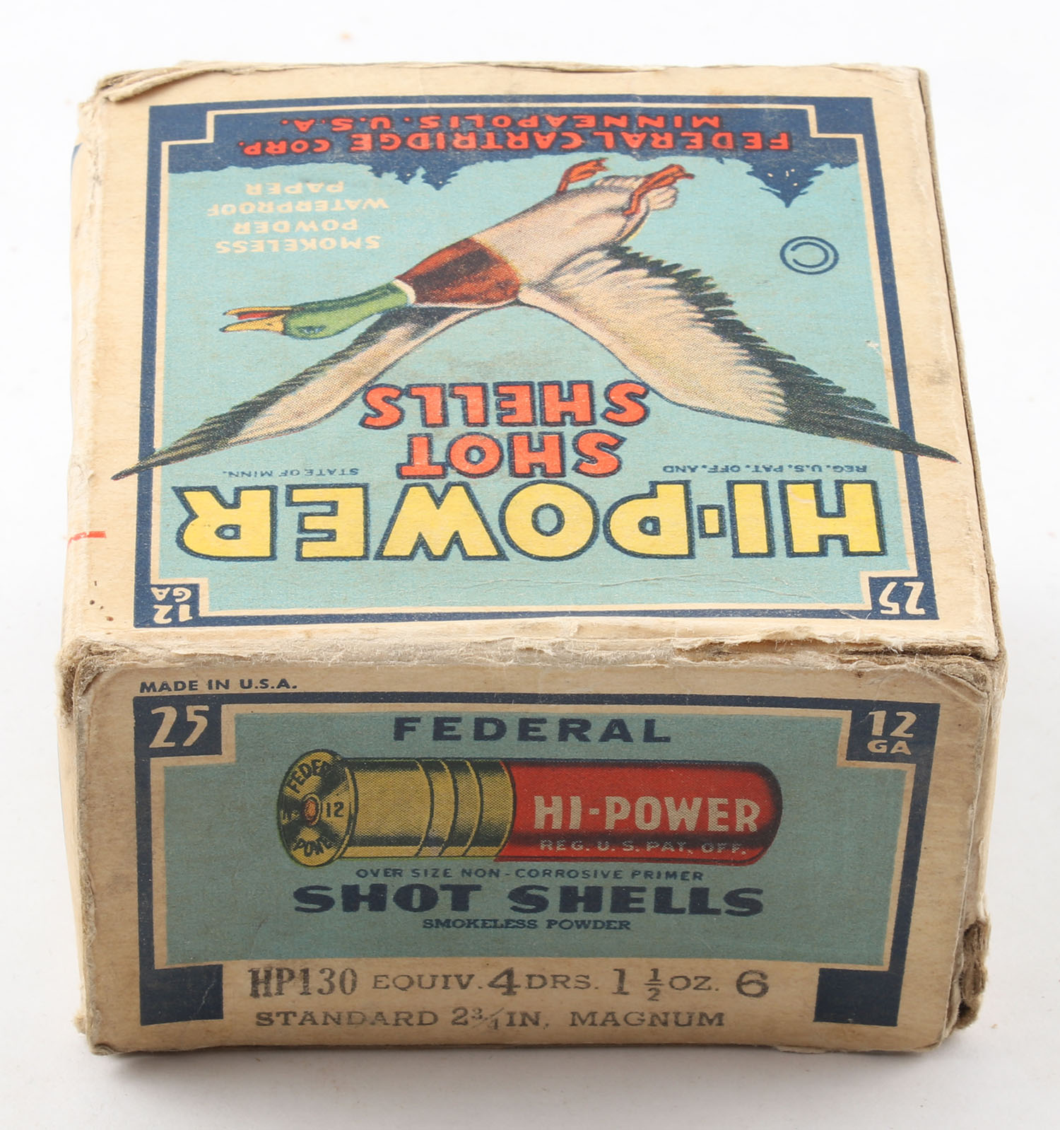 Federal Cart. Co., HI-POWER, 12ga., 1pc., Partial 15rds., shot size 6 Magnum, Blue border, blue, yellow and red box with flying mallard, box has age soiling with edge & corner wear, paper shells are very good. Grade: Good ++ - Value: 10 to 40