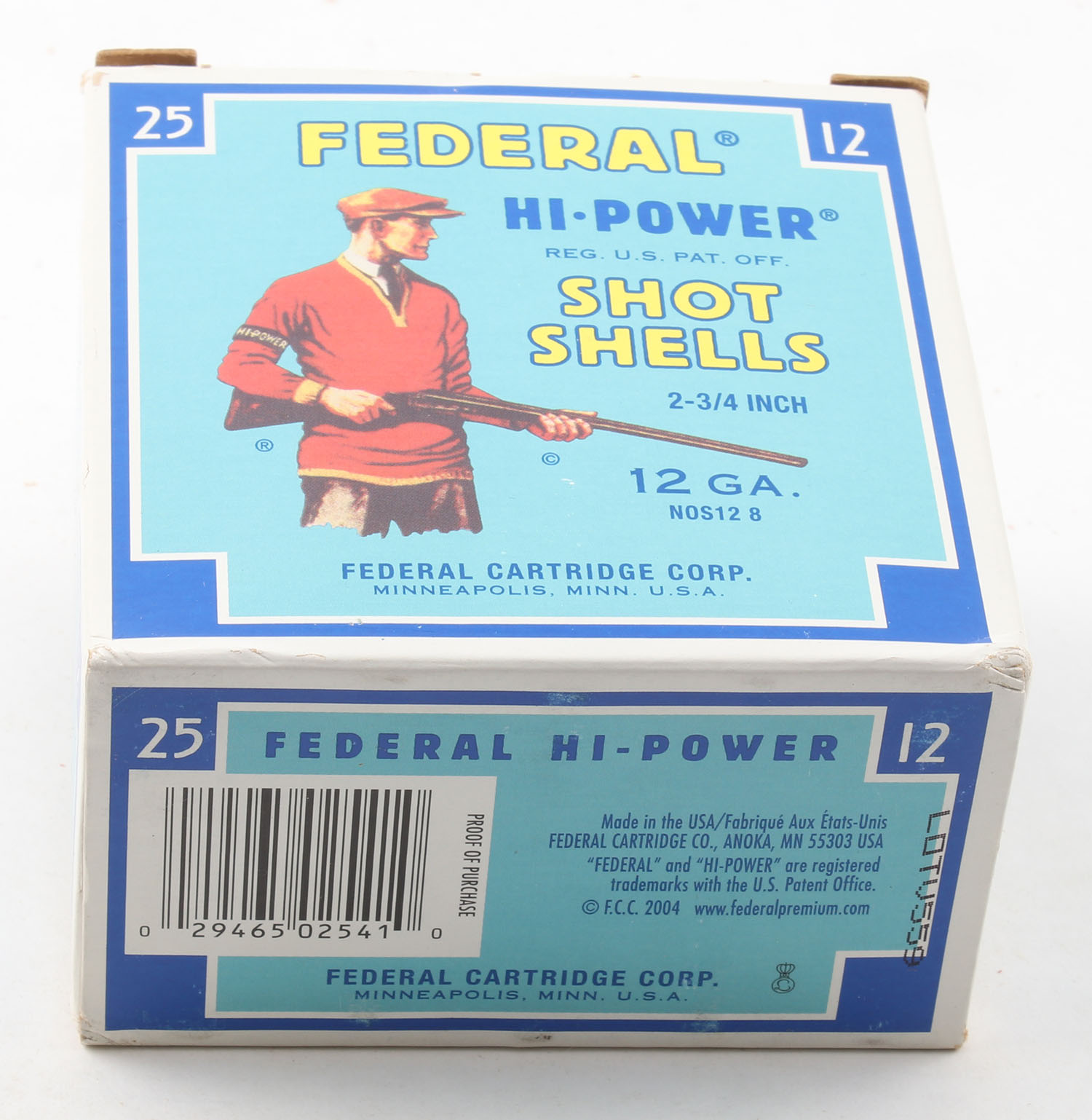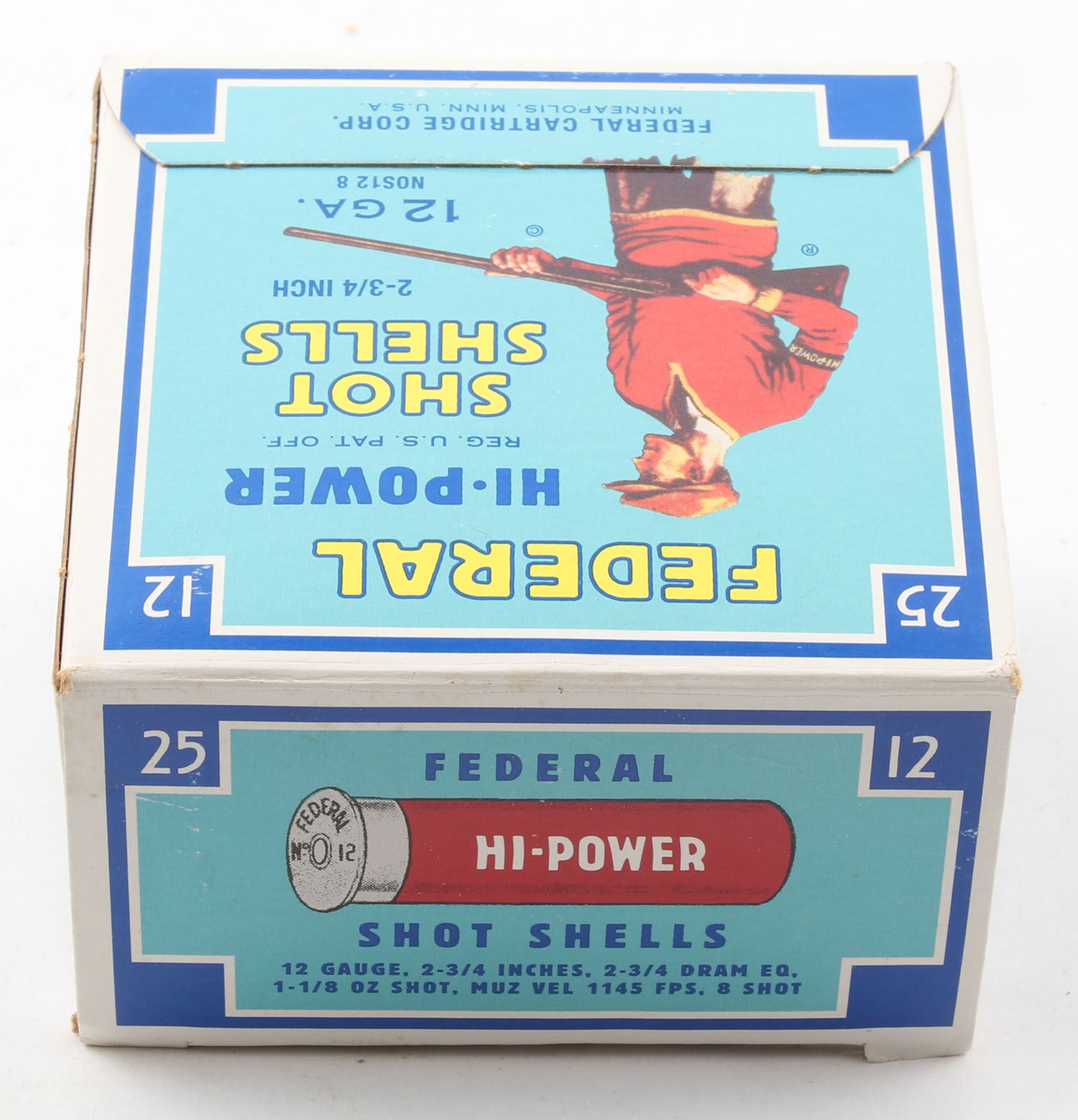 Federal Cart. Co., HI-POWER, 12ga., 2 3/4'', 1pc., Full, shot size 8, Blue border, blue, yellow and red box with Trap Shooter, box is minty with great colors, plastic shells are excellent. Grade: MINT - Value: 40 to 100