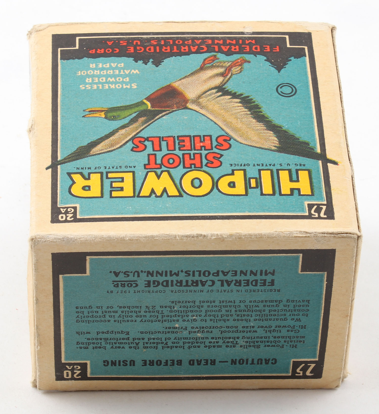 Federal Cart. Co., HI-POWER, 20ga., 1pc., Full, shot size 6, Black border, blue, yellow and red box with flying mallard, box has edge wear with excellent color, paper shells are excellent. Grade: Very Good ++ - Value: 10 to 50