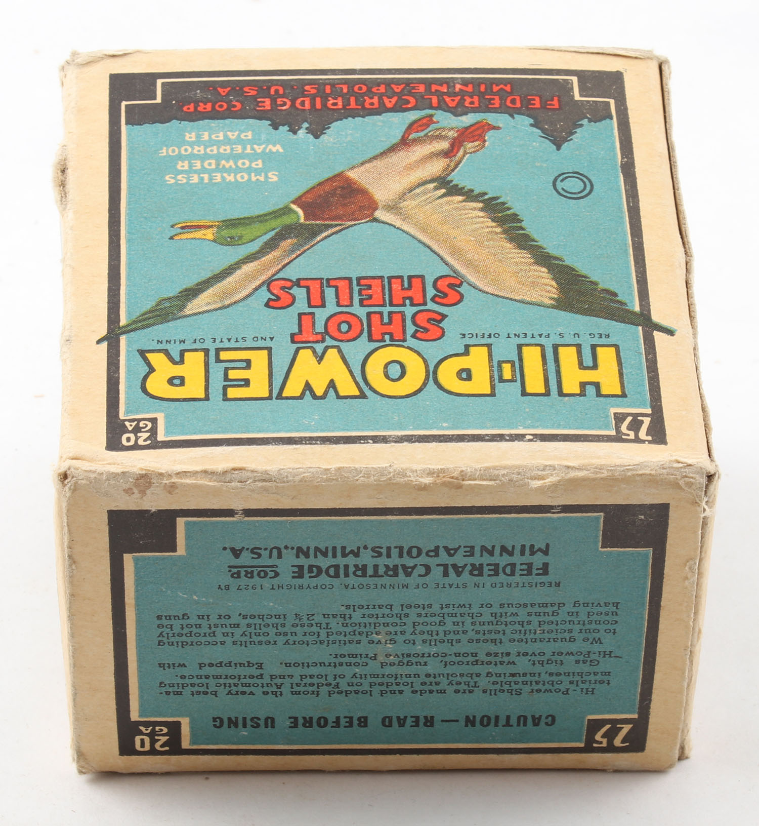 Federal Cart. Co., HI-POWER, 20ga., 1pc., Full, shot size 6, Black border, blue, yellow and red box with flying mallard, box has edge wear with very nice colors, paper shells are excellent. Grade: Very Good ++ - Value: 10 to 40
