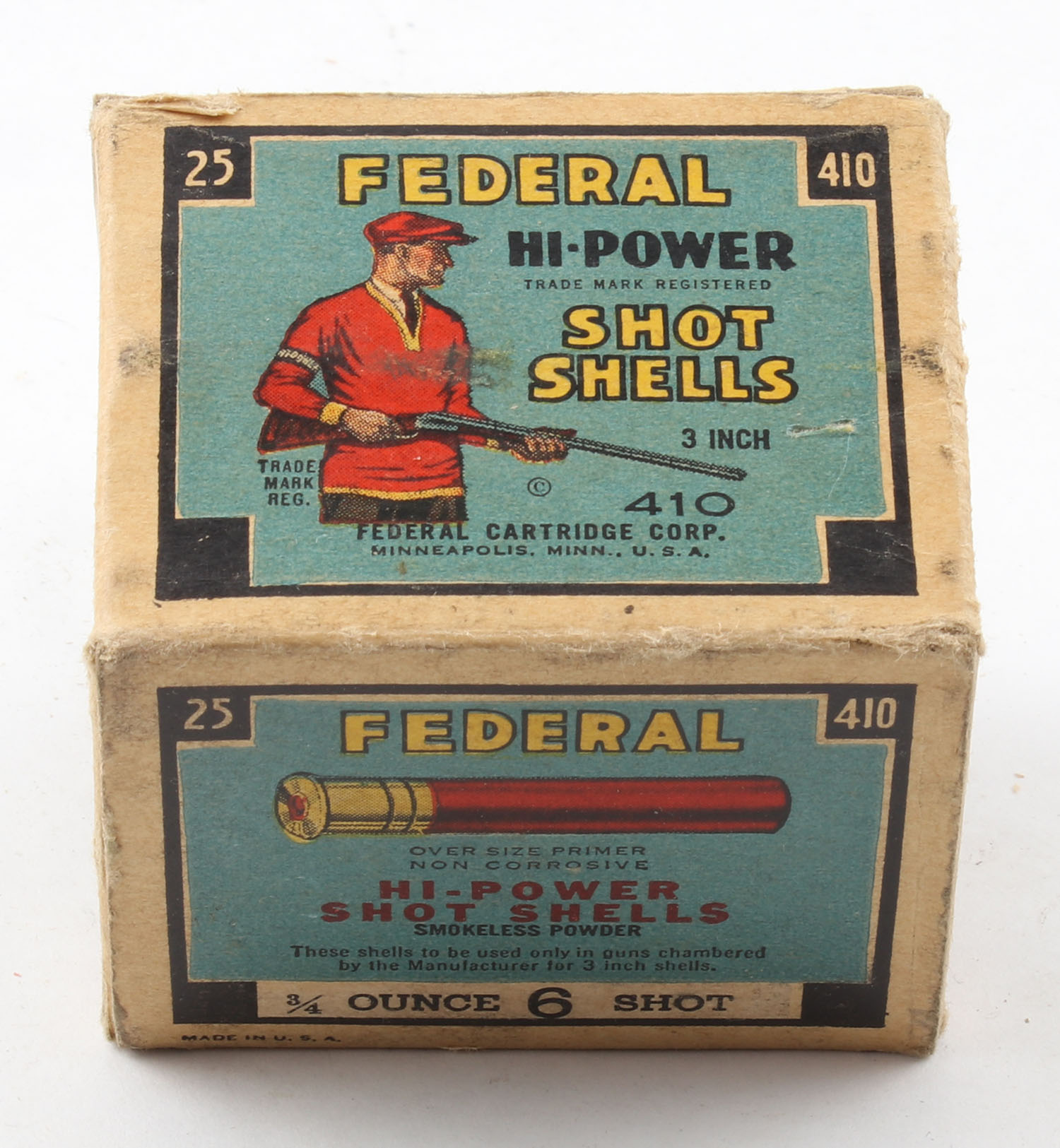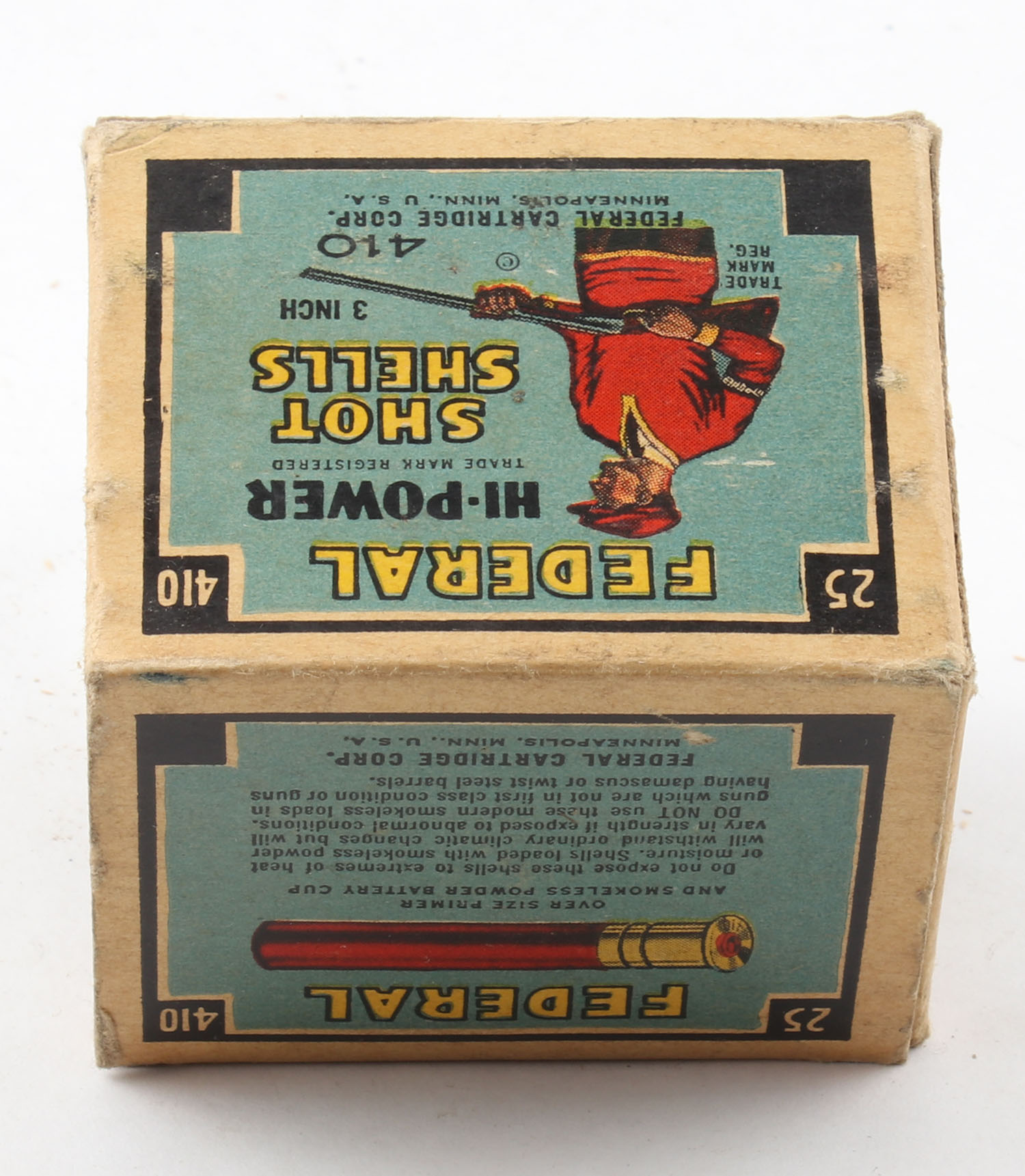 Federal Cart. Co., HI-POWER, 410ga., 3'', 1pc., Full, shot size 6, Black border, blue, yellow and red box with Trap Shooter, box has age soiling with edge wear, paper shells are excellent. Grade: Very Good - Value: 20 to 80