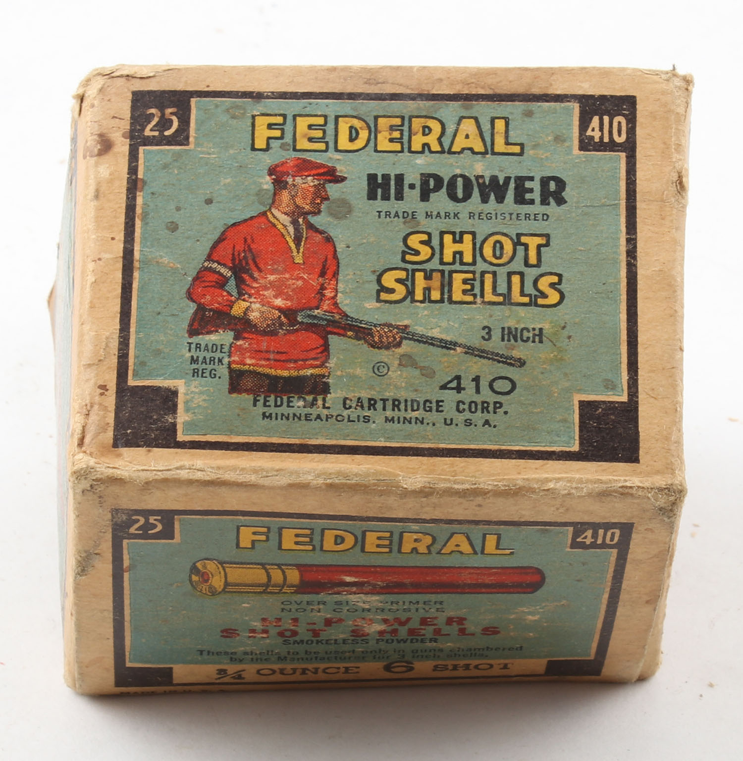 Federal Cart. Co., HI-POWER, 410ga., 3'', 1pc., Full, shot size 6, Black border, blue, yellow and red box with Trap Shooter, box has age soiling with scuffing, has tape to seam split, paper shells are excellent. Grade: Good ++ - Value: 20 to 80