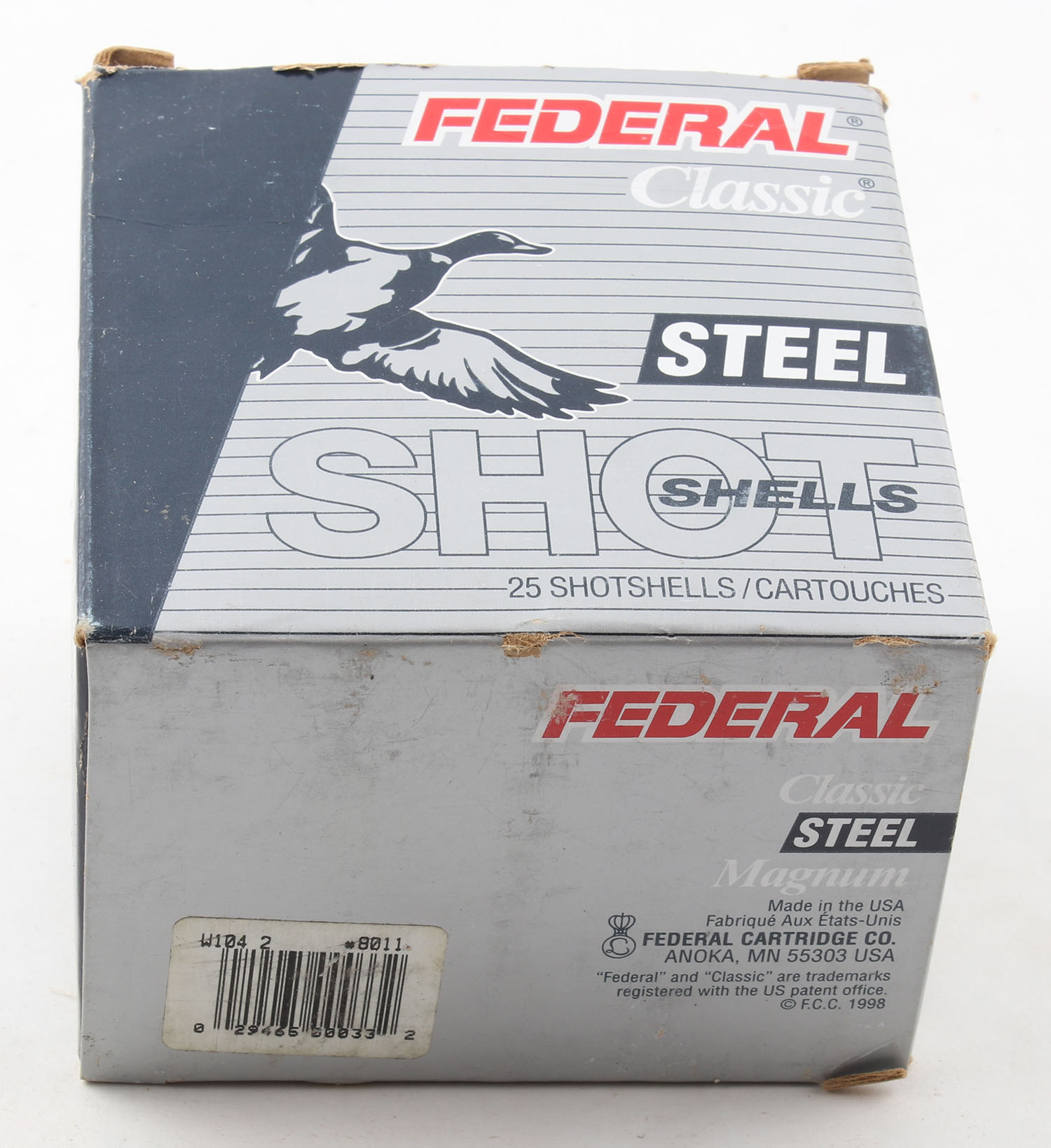Federal, Steel Magnum, 10ga., 1pc., Partial 20rds, shot size 2, 3 1/2'', multi-colored box, box is solid, plastic shells are excellent. Grade: Excellent - Value: 20 to 40