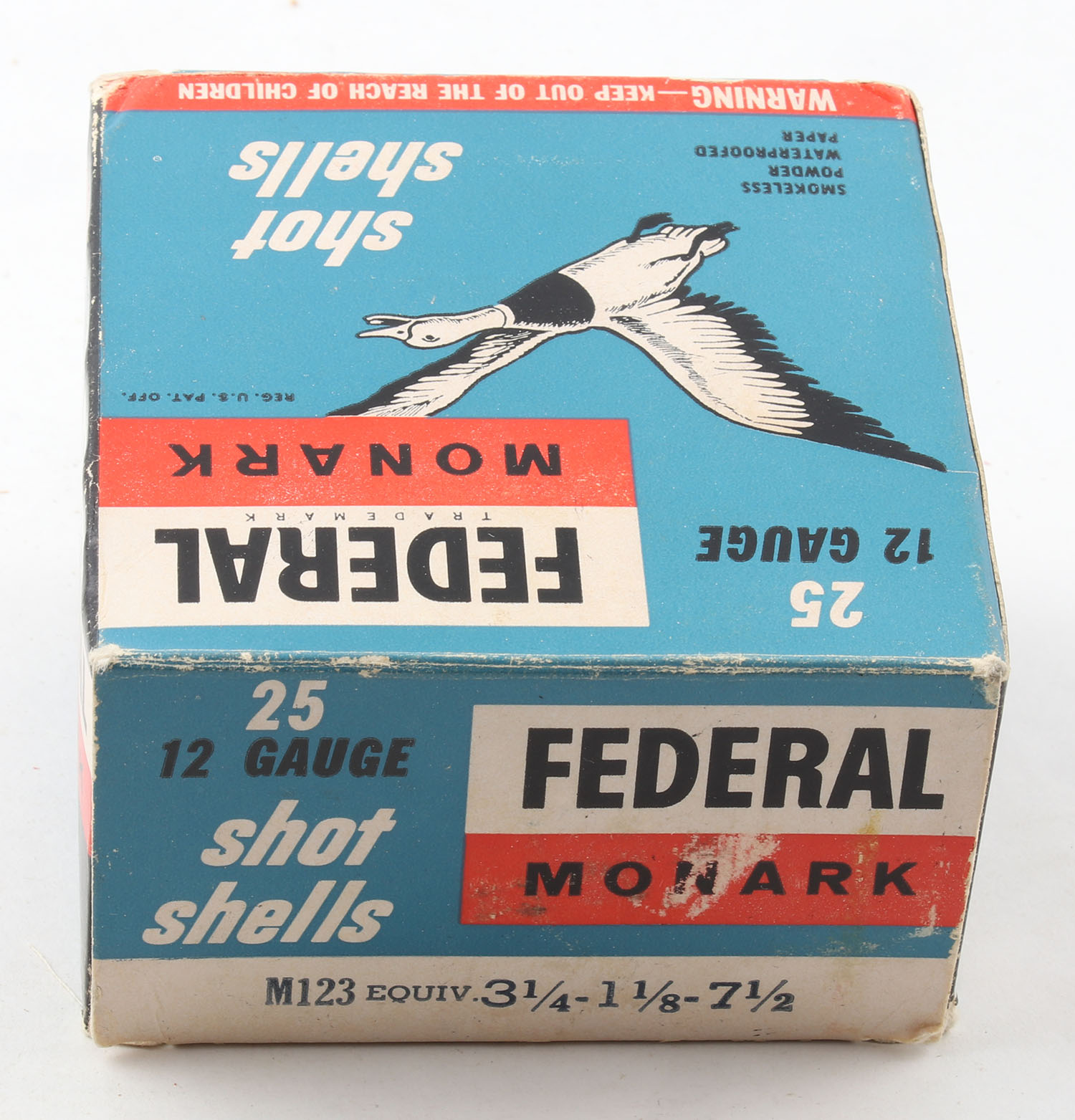 Federal, Monark, 12ga., 1pc., Full, shot size 7 1/2, multi-colored box, box has scuffing & edge wear, paper shells are excellent. Grade: Vey Good ++ - Value: 10 to 30