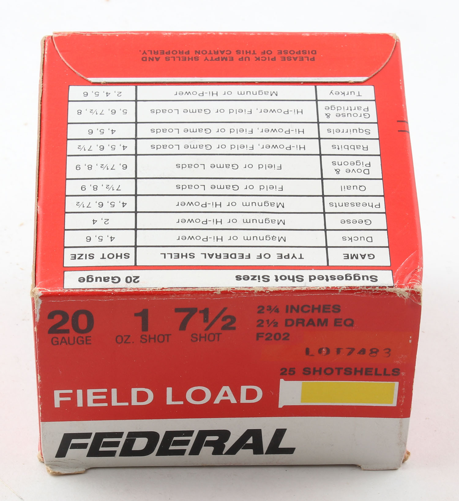 Federal, Field Load, 20ga., 1pc., Full, shot size 7 1/2, multi-colored box, box is very solid, plastic shells are excellent. Grade: Excellent - Value: 10 to 30
