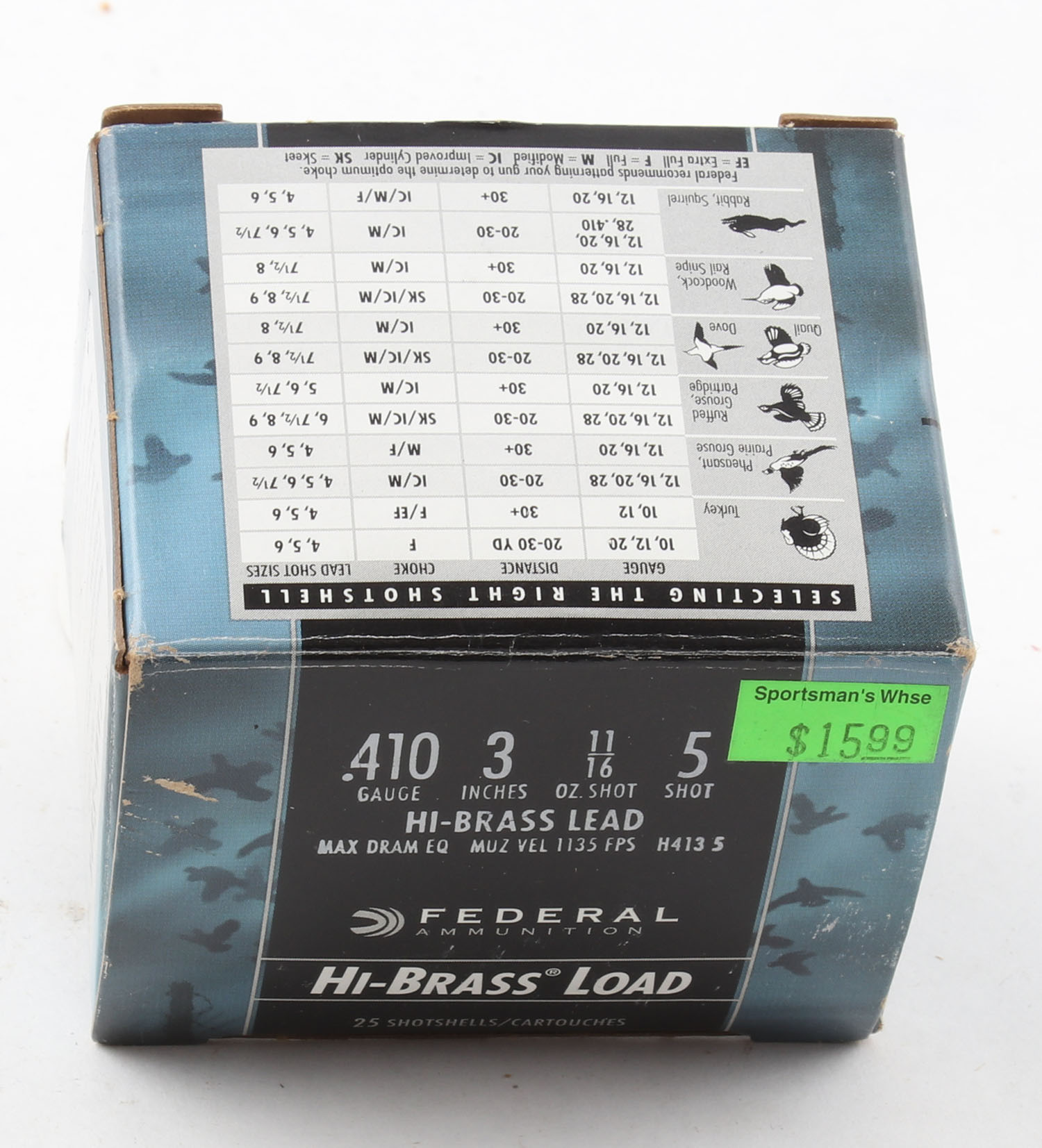 Federal, Game Shok, 410ga., 3'', 1pc., Full, shot size 5 High Brass Lead, multi-colored box, box is solid, shells are excellent. Grade: Excellent - Value: 10 to 40