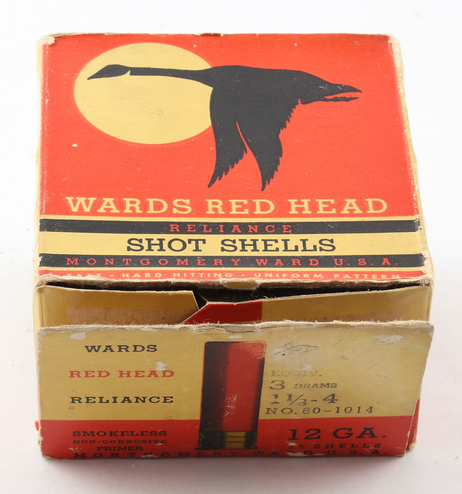 Montgomery Ward & Co., Red Head Reliance, 12ga., 1pc., Full, shot size 4, red background with black goose flying through the moon, box has light age soiling & scuffing, has edge & corner wear with a partial tear to bottom flap, paper shells are excellent. Grade: Very Good - Value: 20 to 80