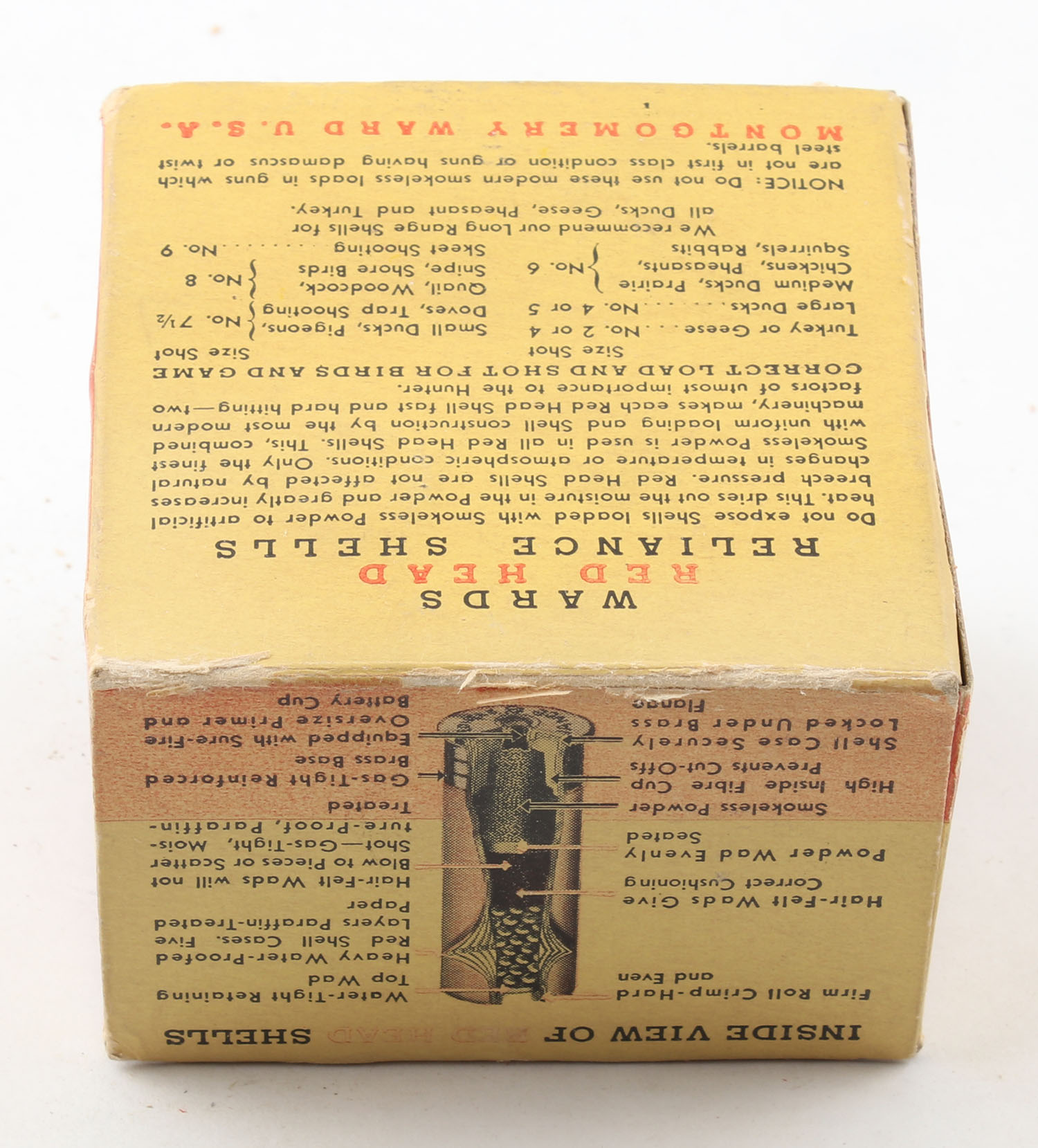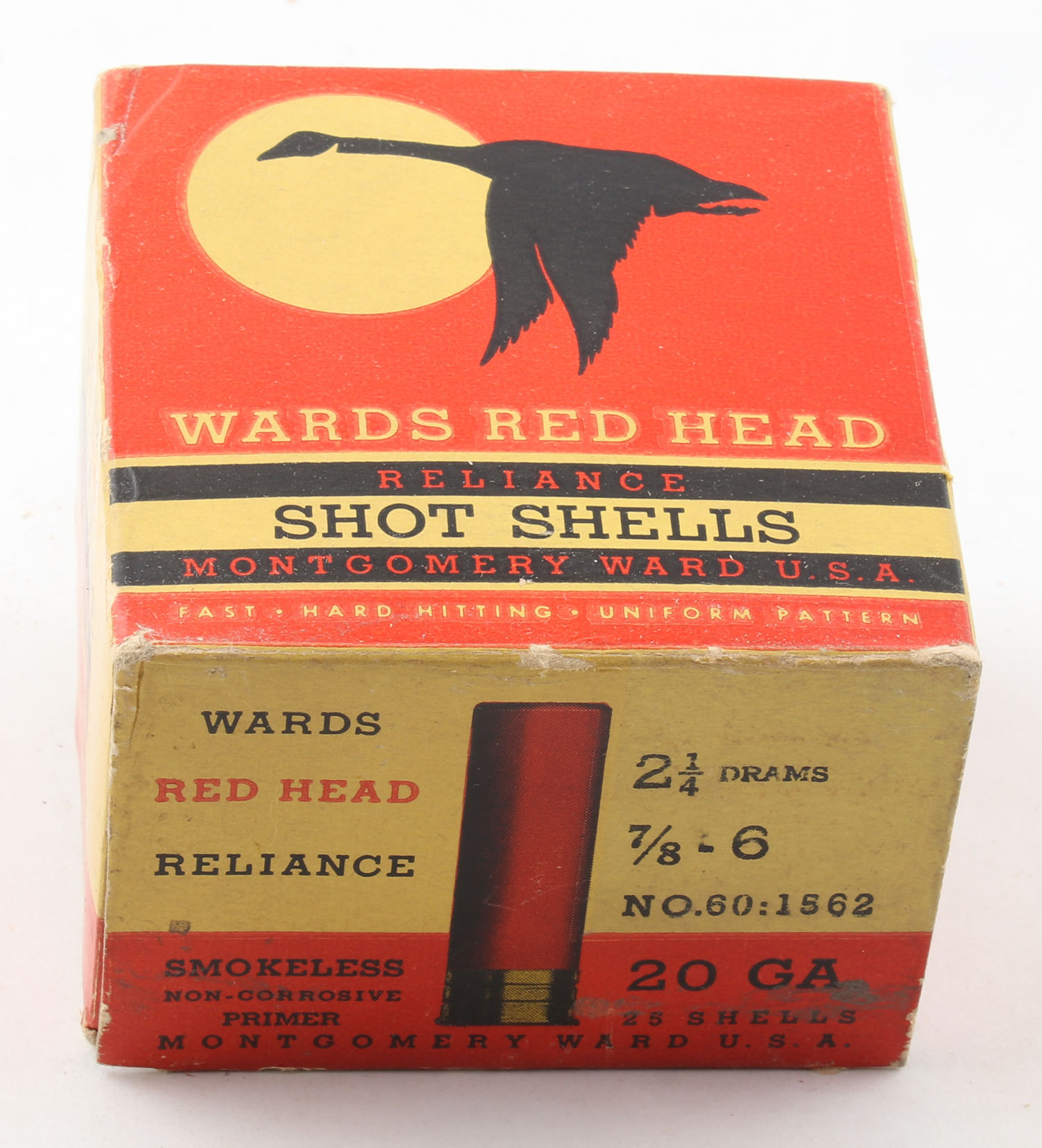 Montgomery Ward & Co., Red Head Reliance, 20ga., 1pc., Full with INSERT, shot size 6, red background with black goose flying through the moon, box is solid with excellent color, has some edge & corner wear, paper shells are excellent. Grade: Excellent - Value: 20 to 80