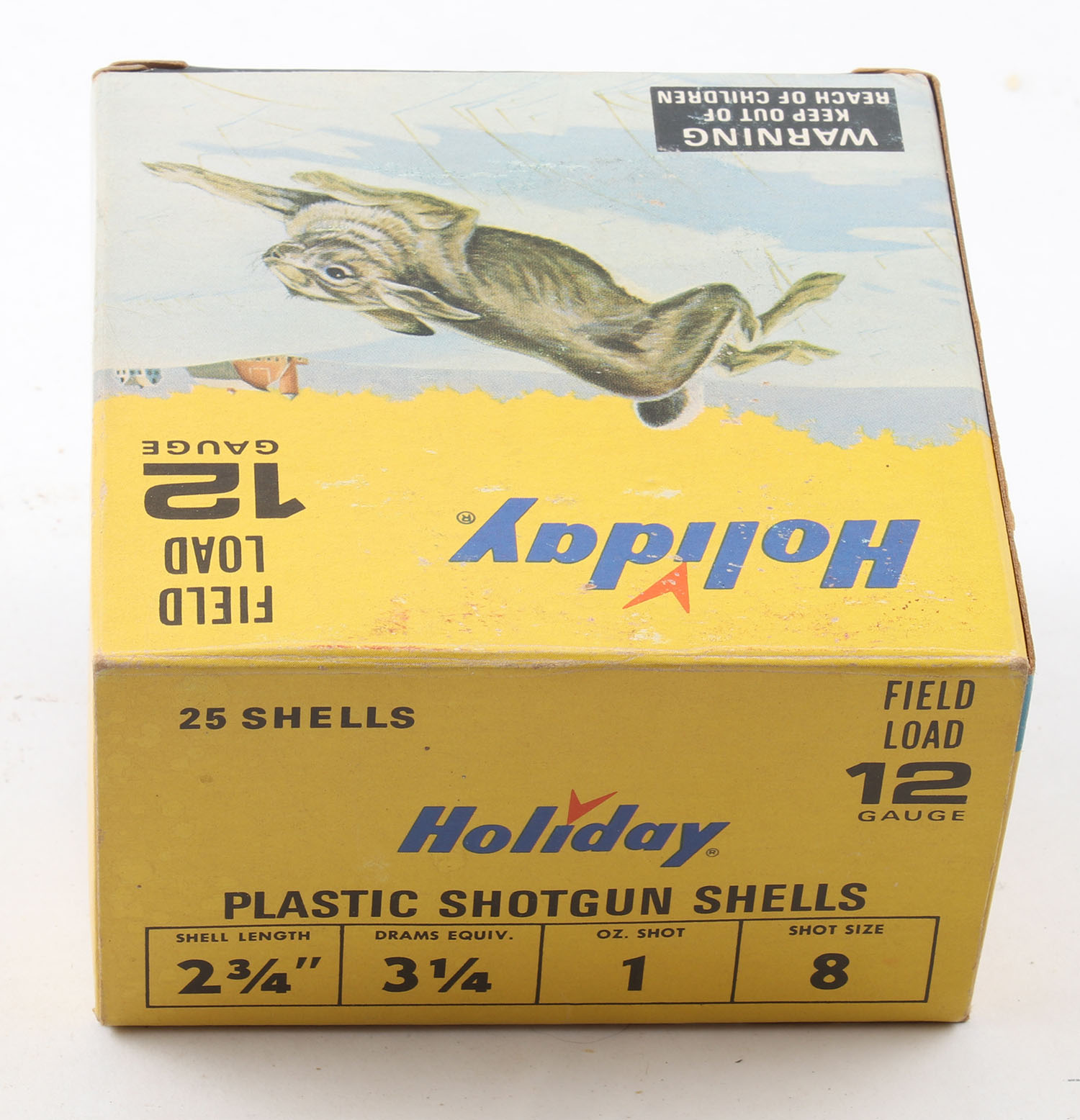 Holiday, Grouse/Rabbit Scene, 12ga., 1pc., Full, 2 3/4'', shot size 8, multi color graphics of Grouse/Rabbit by Les Kouba, box is solid with excellent colors, box has light scuffing, plastic shells are excellent. Grade: Excellent - Value: 40 to 80