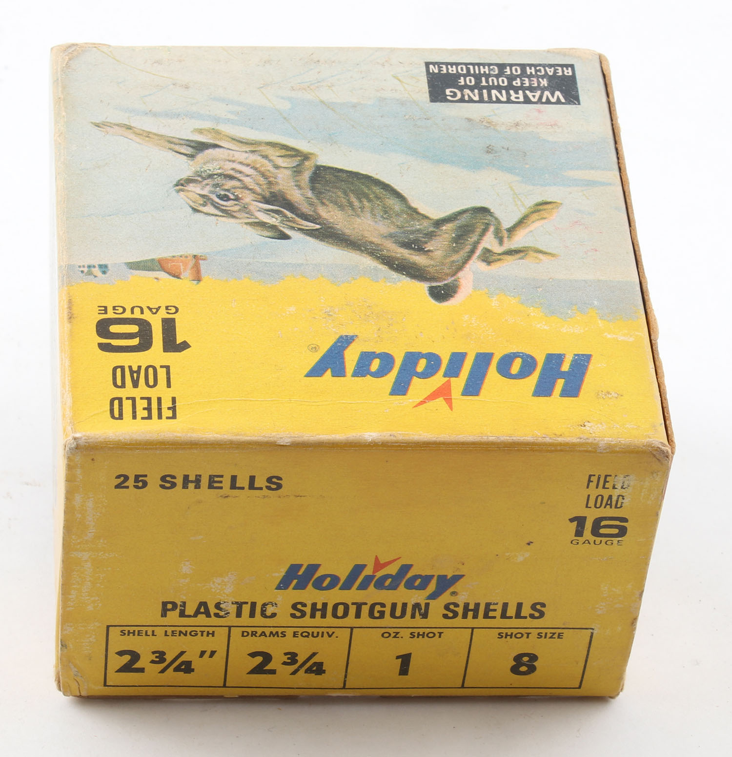 Holiday, Grouse/Rabbit Scene, 16ga., 1pc., Empty, 2 3/4'', shot size 8, multi color graphics of Grouse/Rabbit by Les Kouba, box has light age soiling with excellent colors. Grade: Very Good ++ - Value: 10 to 40