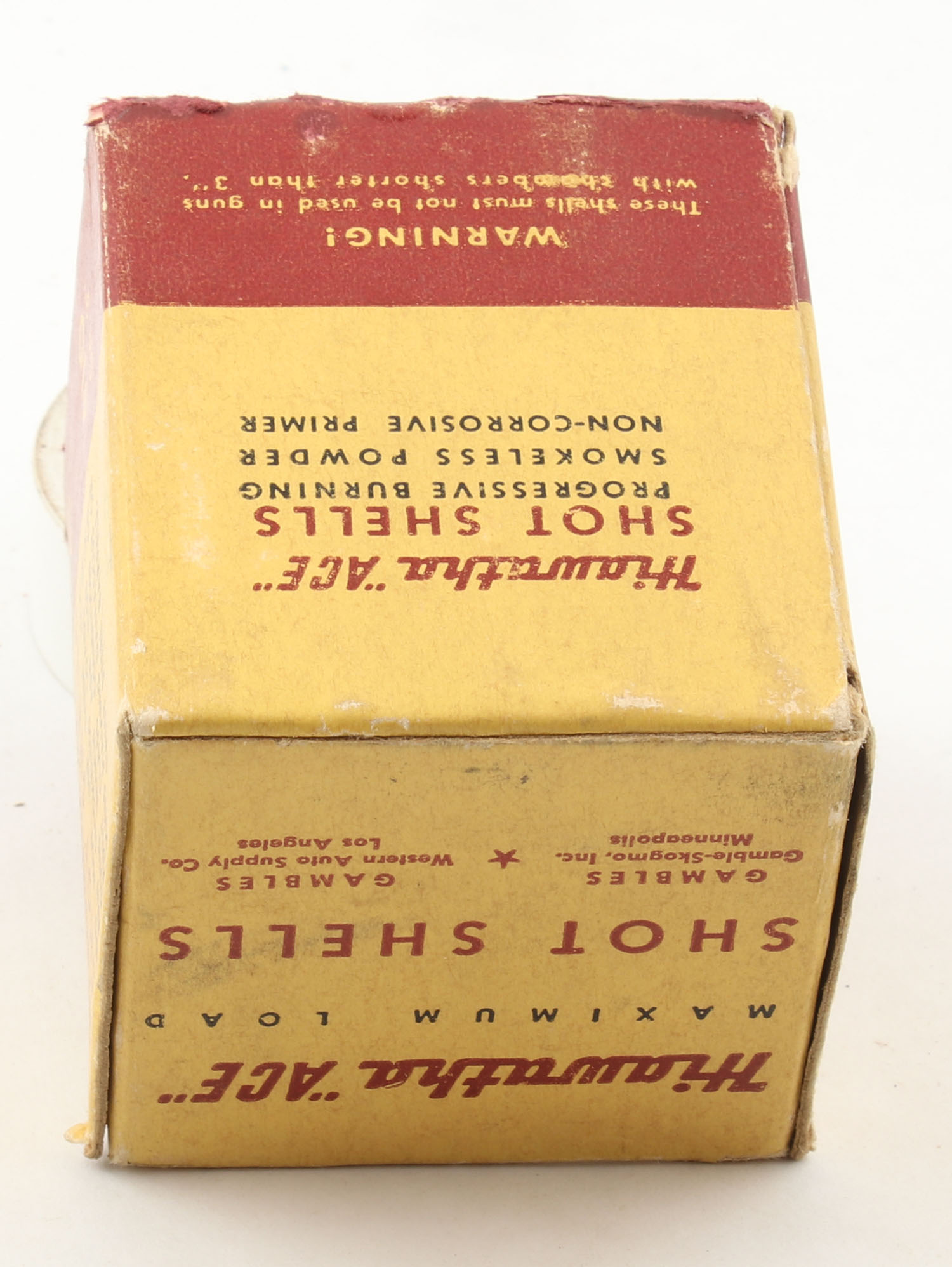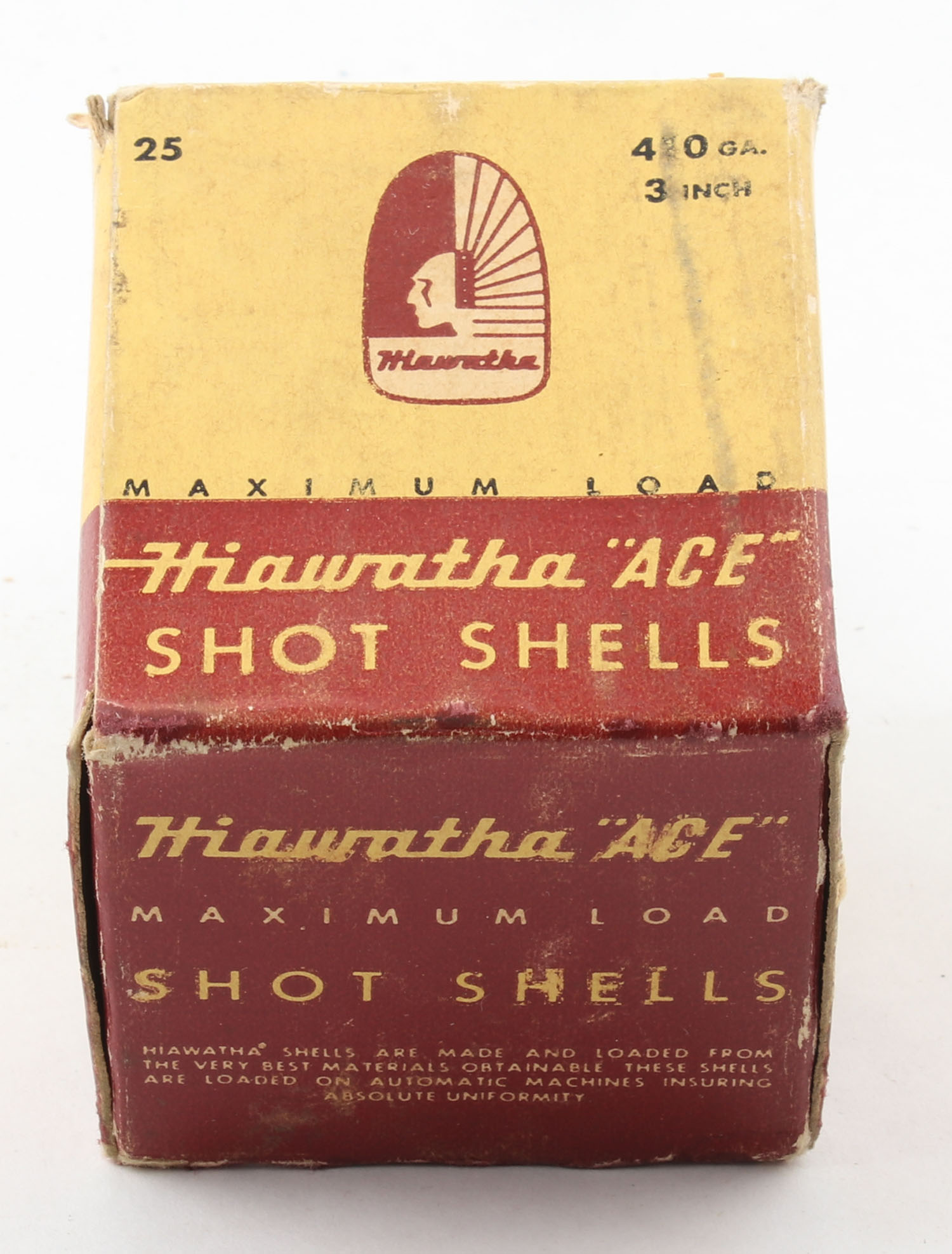 Gambles, Hiawatha ACE, 410ga., 1pc., Full, shot size 6, 3'', yellow, maroon & white box, box has scuffing with great color, paper shells are excellent. Grade: Very Good - Value: 20 to 100