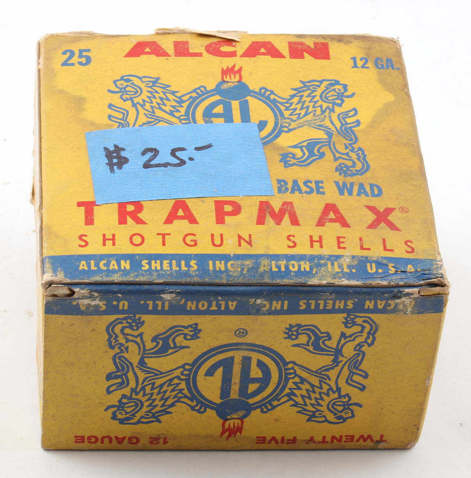Alcan, Trapmax, 12ga., 1pc., Full, shot size 8Ch., multi-colored box, box has a seam split to top flap, paper shells are very good. Grade: Good ++ - Value: 10 to 30