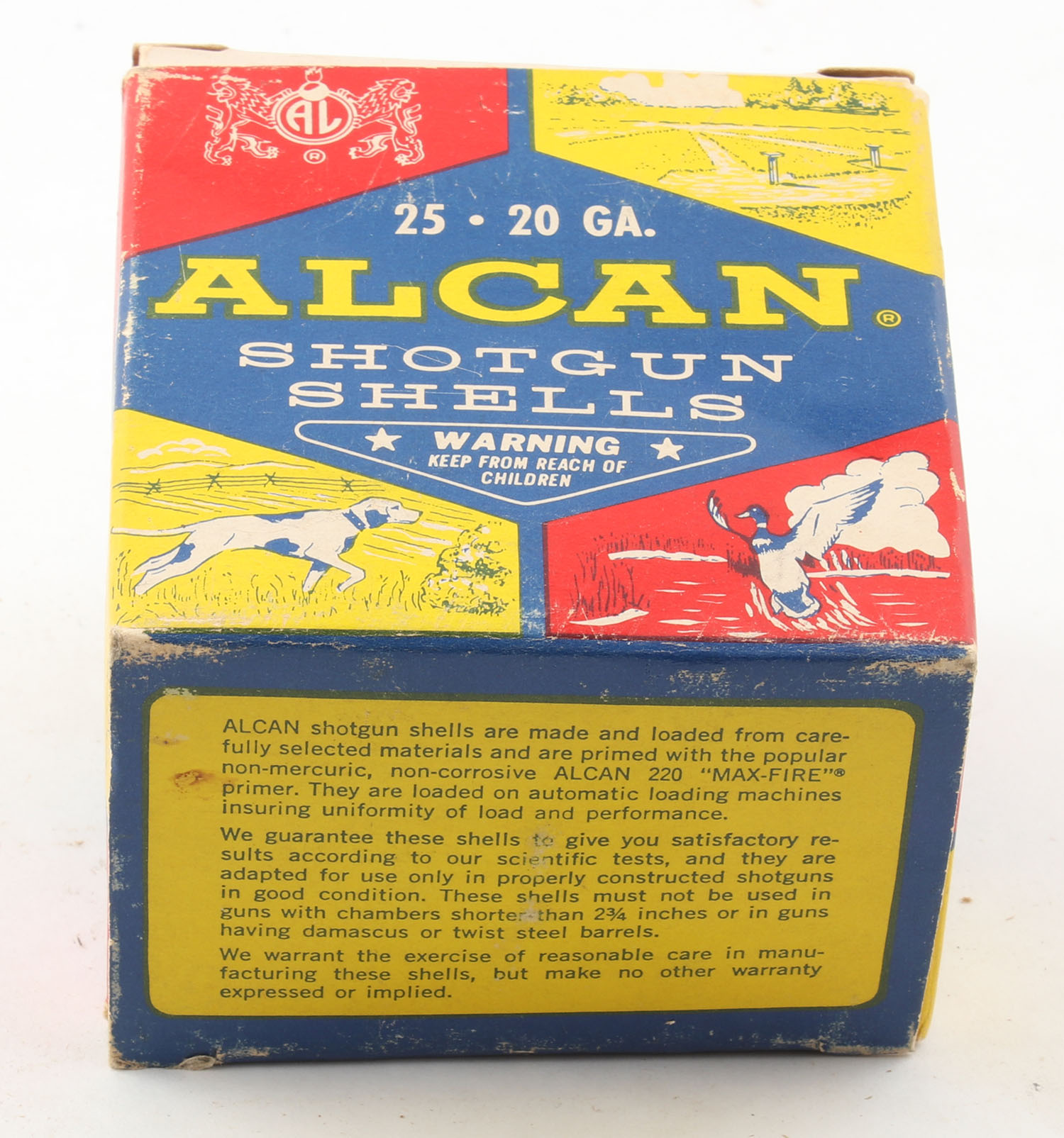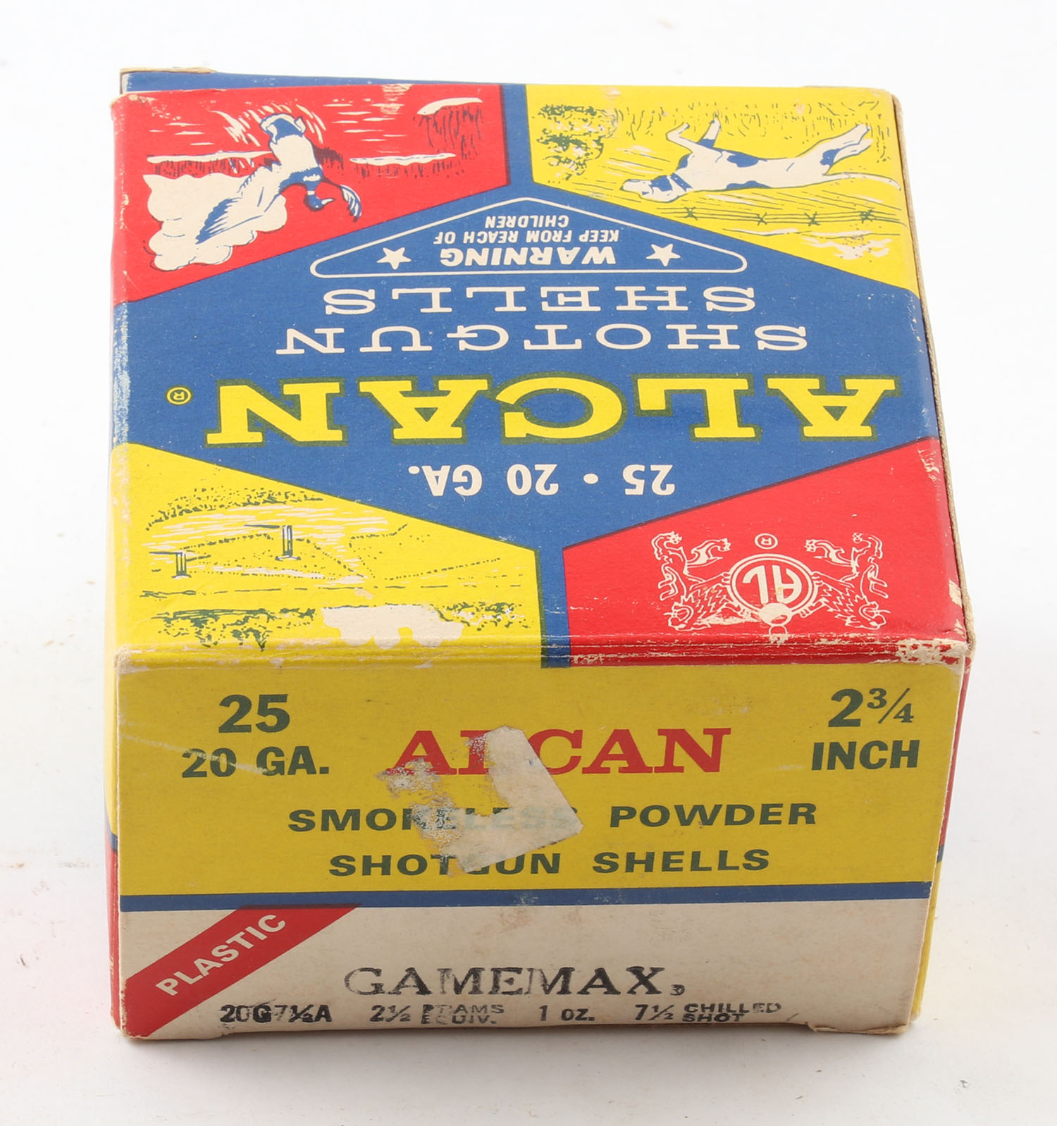 Alcan, Smokeless Powder, Gamemax, 20ga., Full, 1pc., shot size 7 1/2Ch., 2 3/4'', multi-colored box, box is very solid with great color, plastic shells are excellent. Grade: Excellent+ - Value: 10 to 40