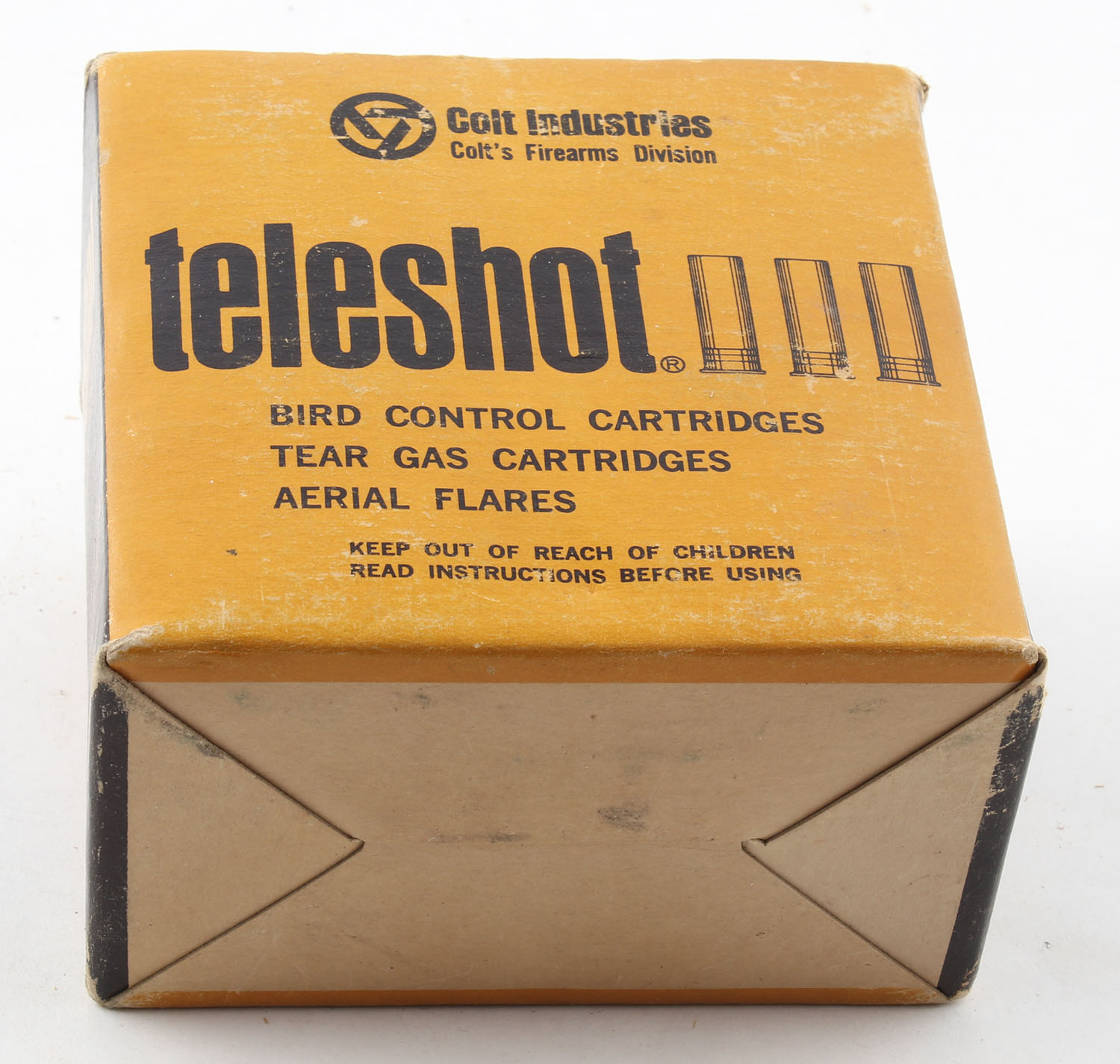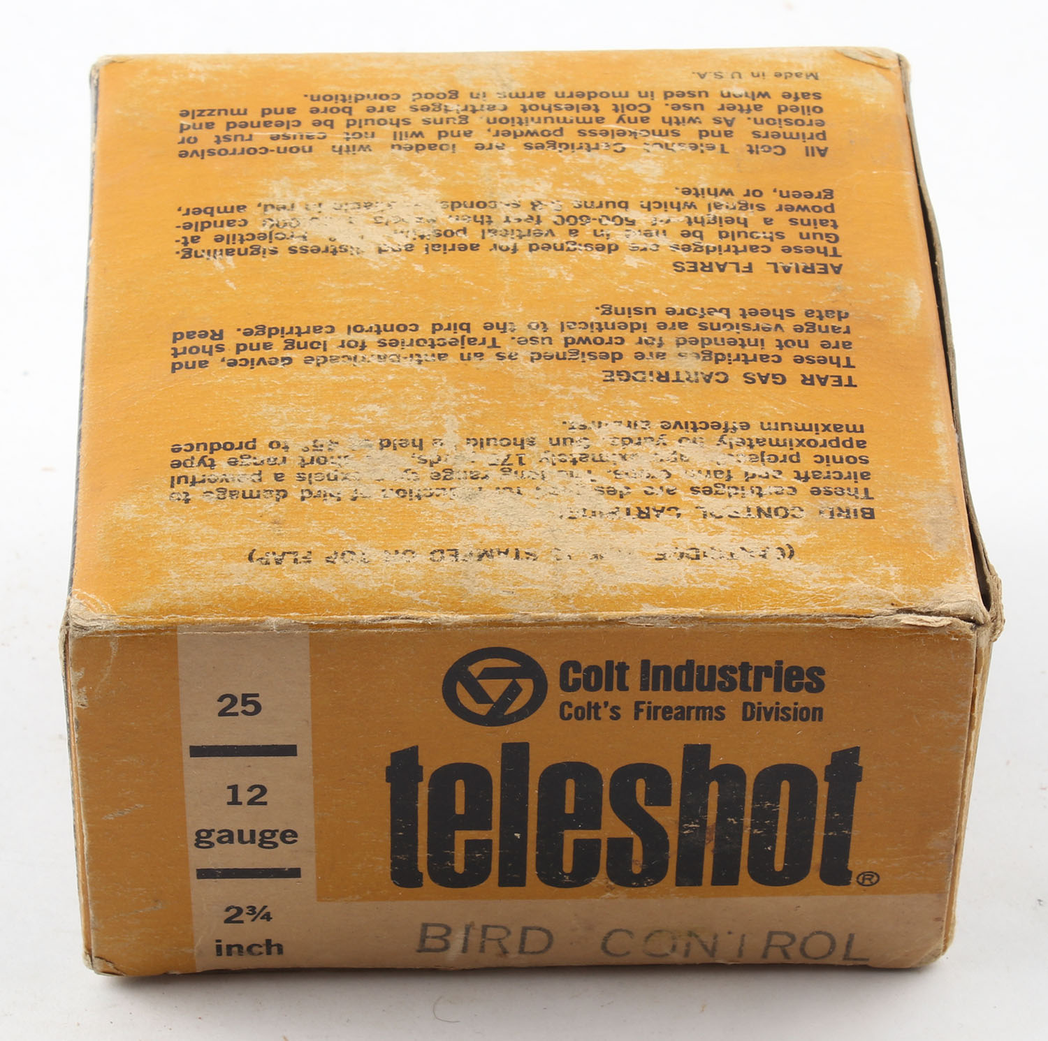 Colt Industries, Teleshot, 12ga., 1pc., Full, shot size Bird Control, 2 3/4'', black & yellow box, box is solid, plastic shells are excellent. Grade: Very Good ++ - Value: 20 to 60
