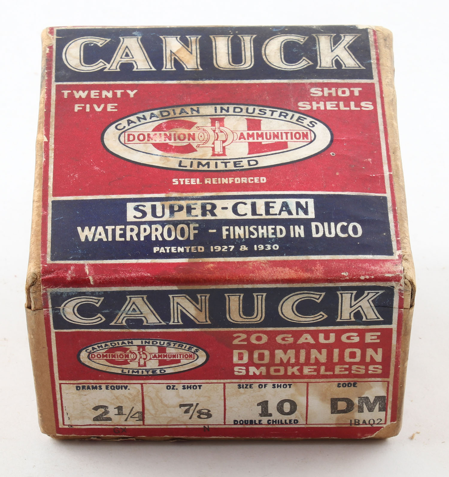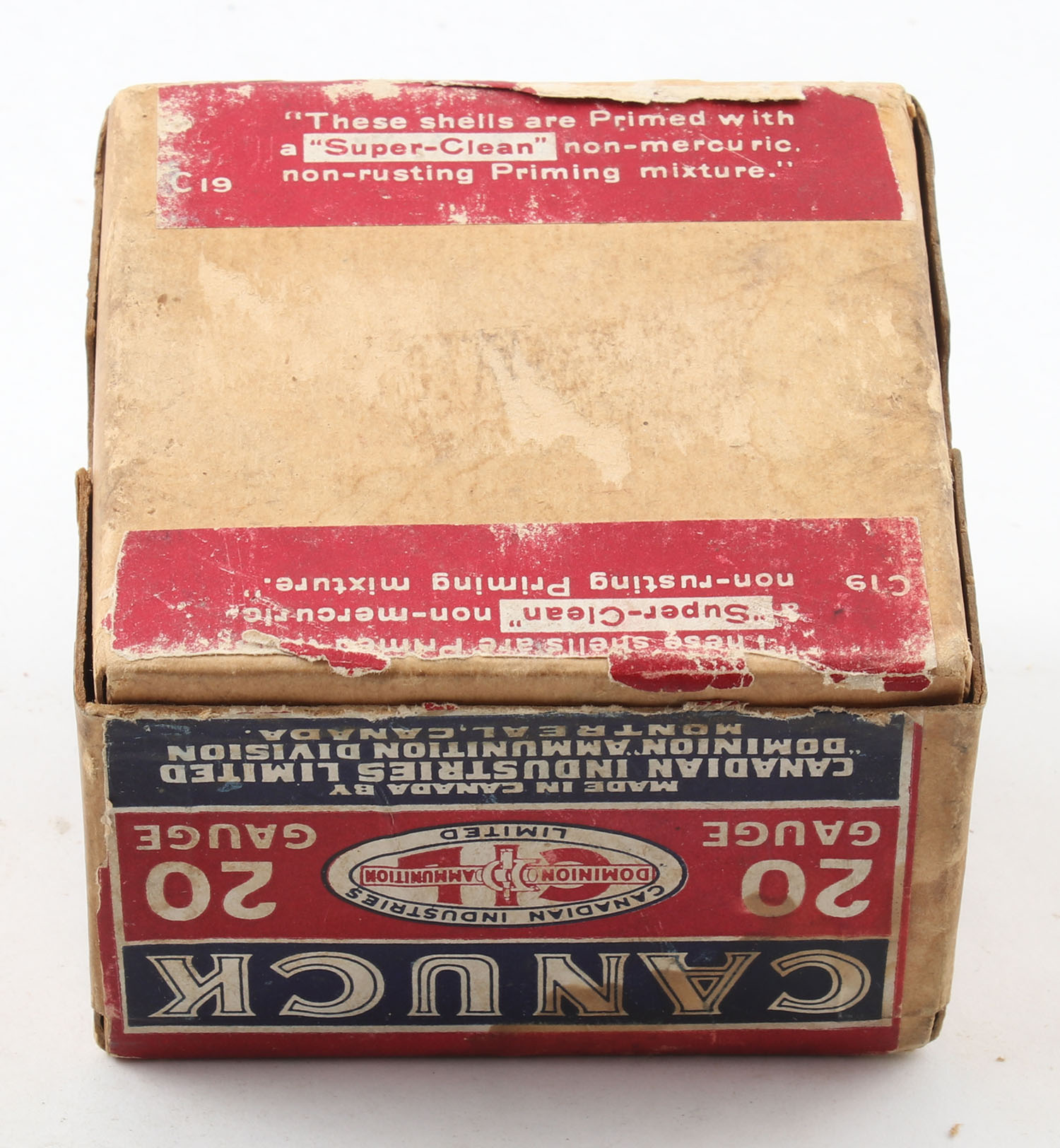 Dominion Cart. Co., Canuck, 20ga., 2pc., Partial 24rds of Fired shells, shot size 10 Double Chilled, red, blue & white box, box has age soiling with edge & corner wear, label is intact with excellent color, fired shots are very good. Grade: Very Good + - Value: 40 to 100