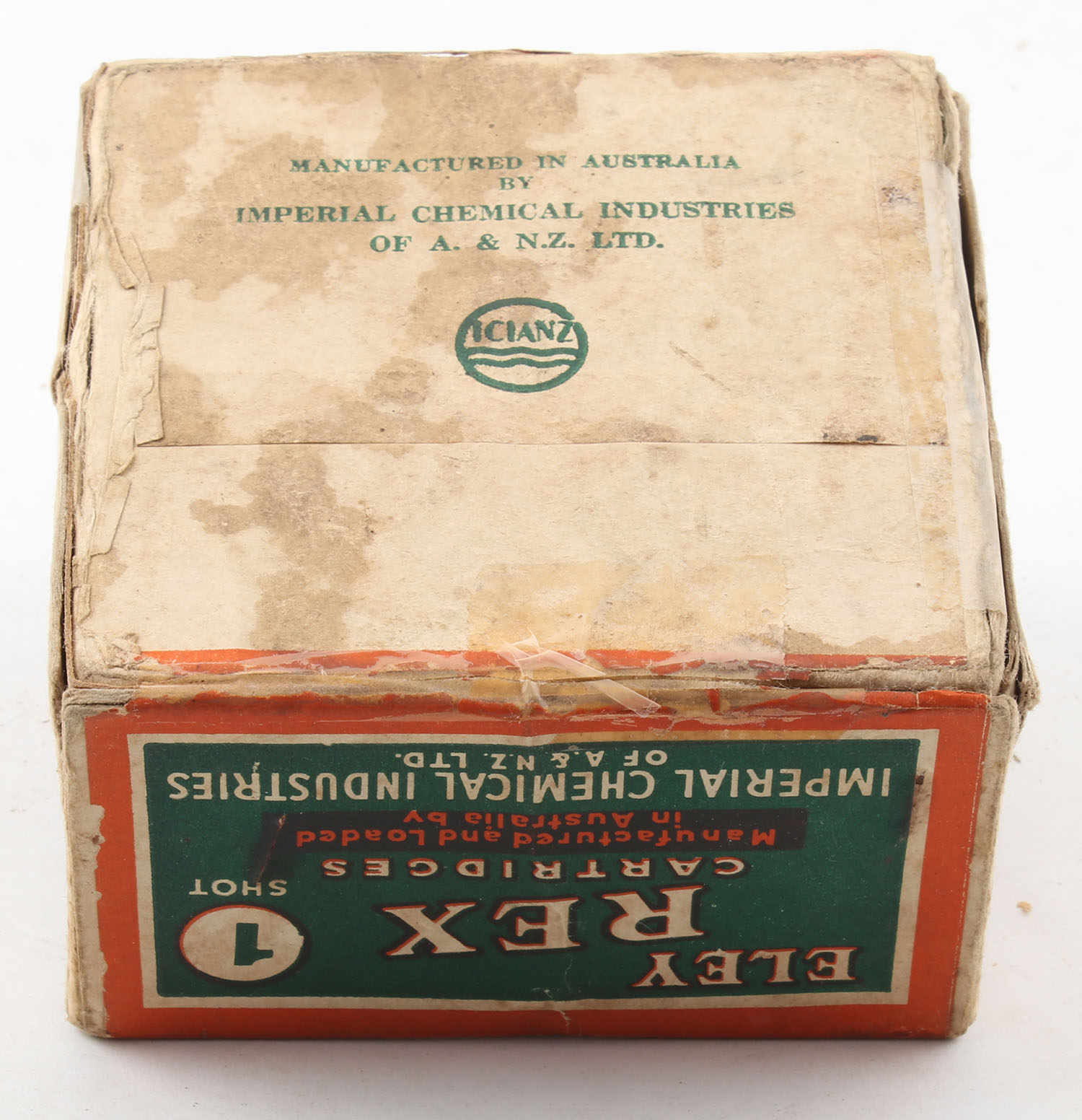 Eley, REX Cartridges, 12ga., 2pc., Empty, shot size 1, 2 1/2'', multi-colored box, box has age soiling & edge wear, box has tape repairs to seam splits, has writing on side of box, label is intact with great colors. Grade: Very Good - Value: 40 to 200