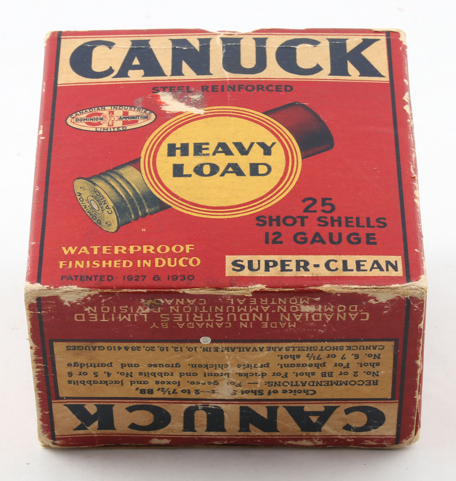 CIL, Canuck, Heavy Load, 12ga., 1pc., Empty, shot size 3CH., multi-colored box, box has edge & corner wear with excellent color. Grade: Excellent - Value: 10 to 50