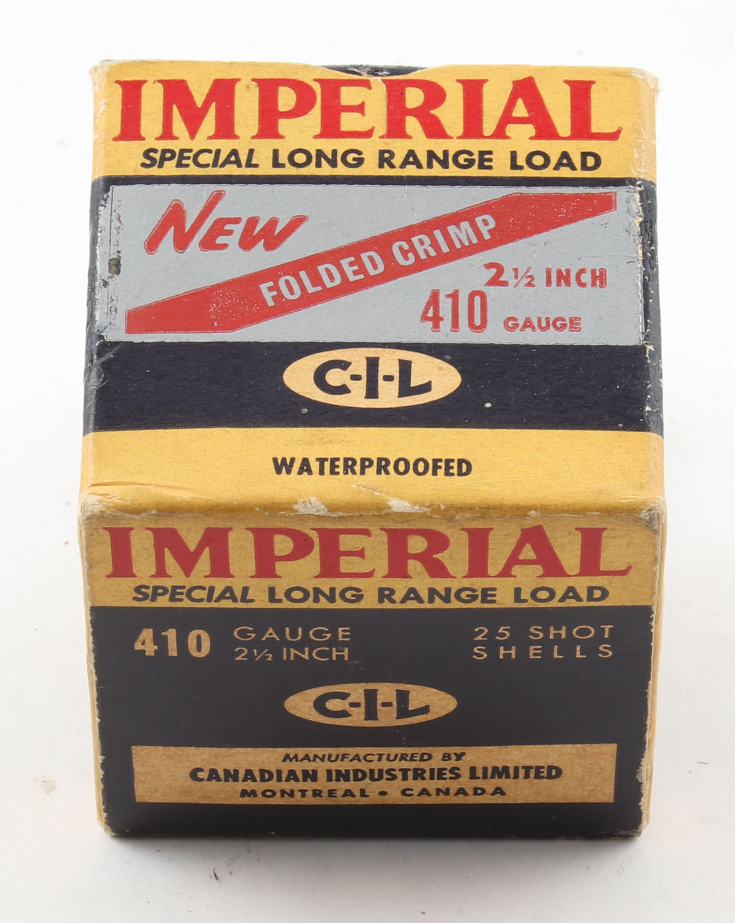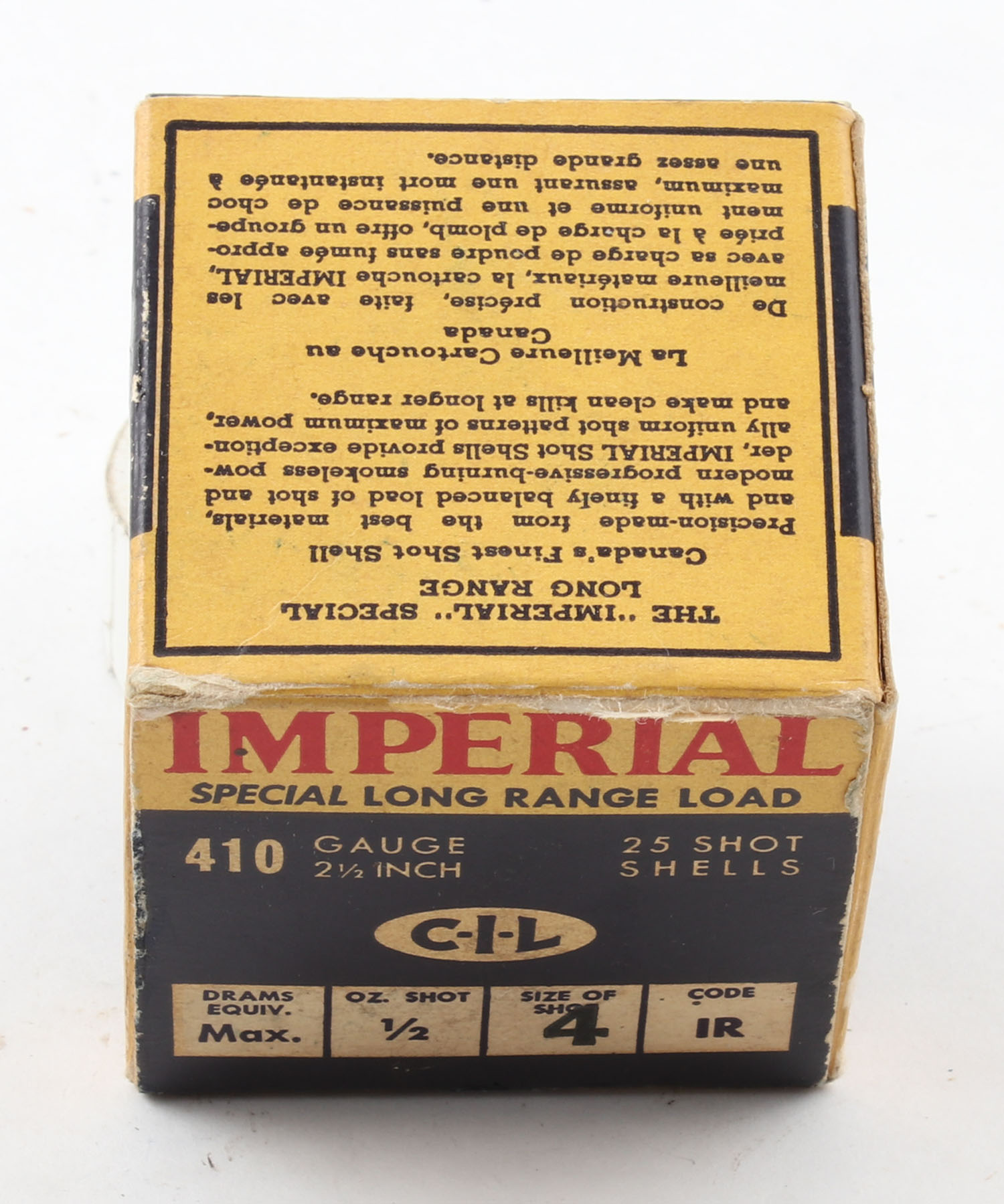 CIL, Imperial, Special Long Range Load, 410ga., 1pc., Partial 24rds., shot size 4, 2 1/2'', box has light edge wear with great colors, paper shells are excellent. Grade: Excellent - Value: 20 to 60