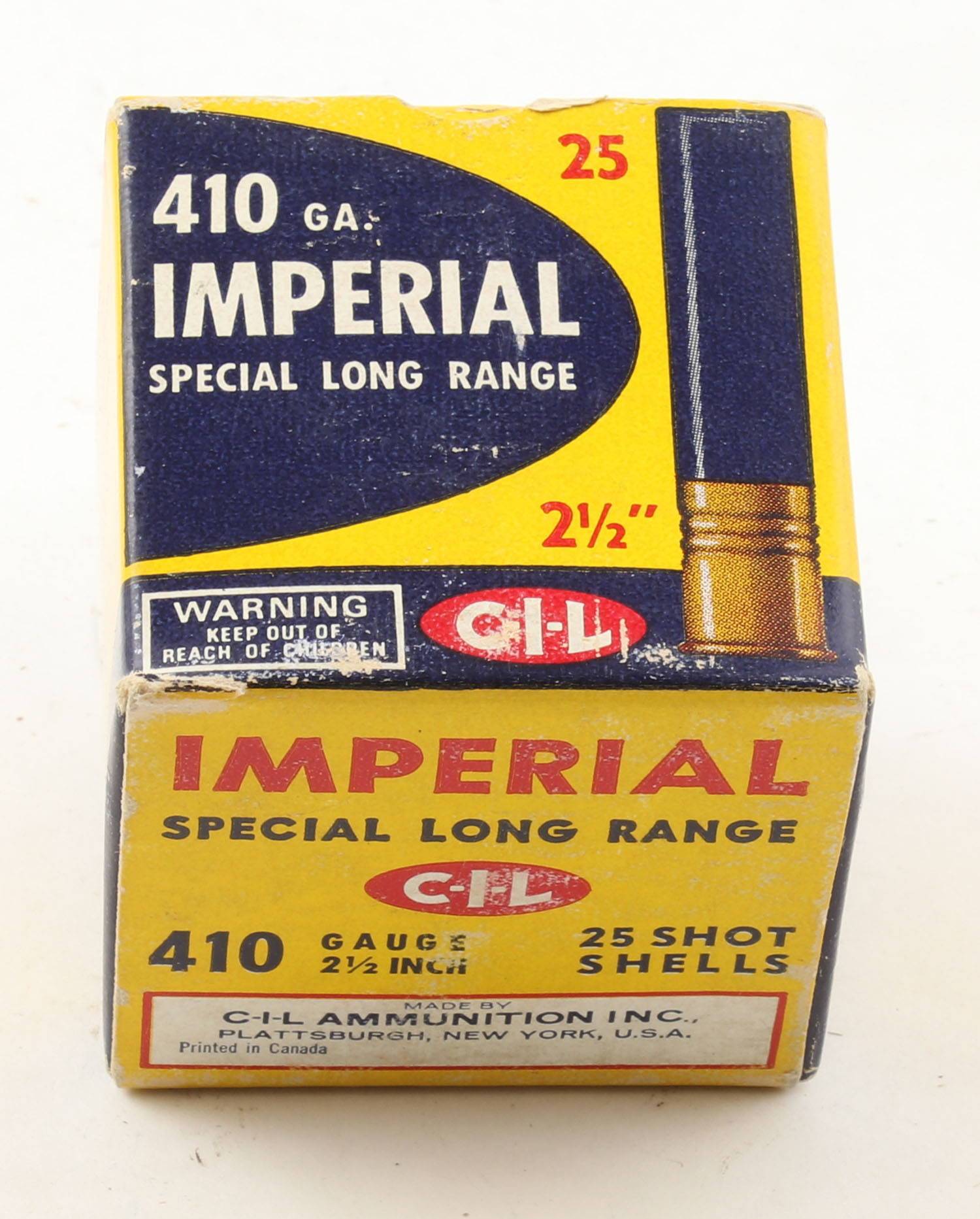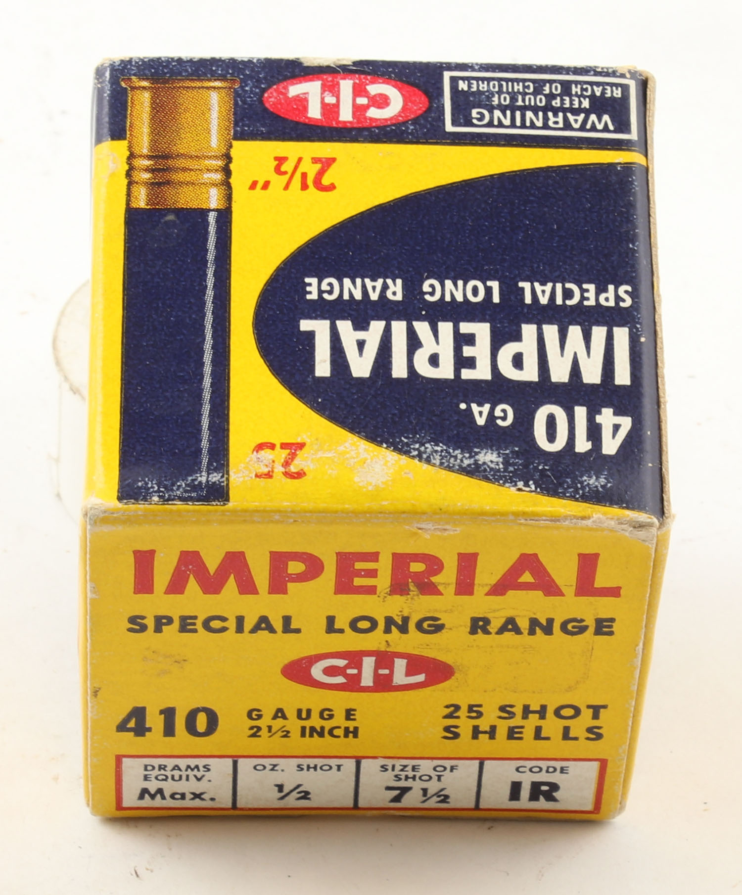 CIL, Imperial, Special Long Range, 410ga., 1pc., 2 1/2'', Full, shot size 7 1/2, multi-colored box, box is solid with very nice colors, paper shells are excellent. Grade: Excellent - Value: 20 to 60