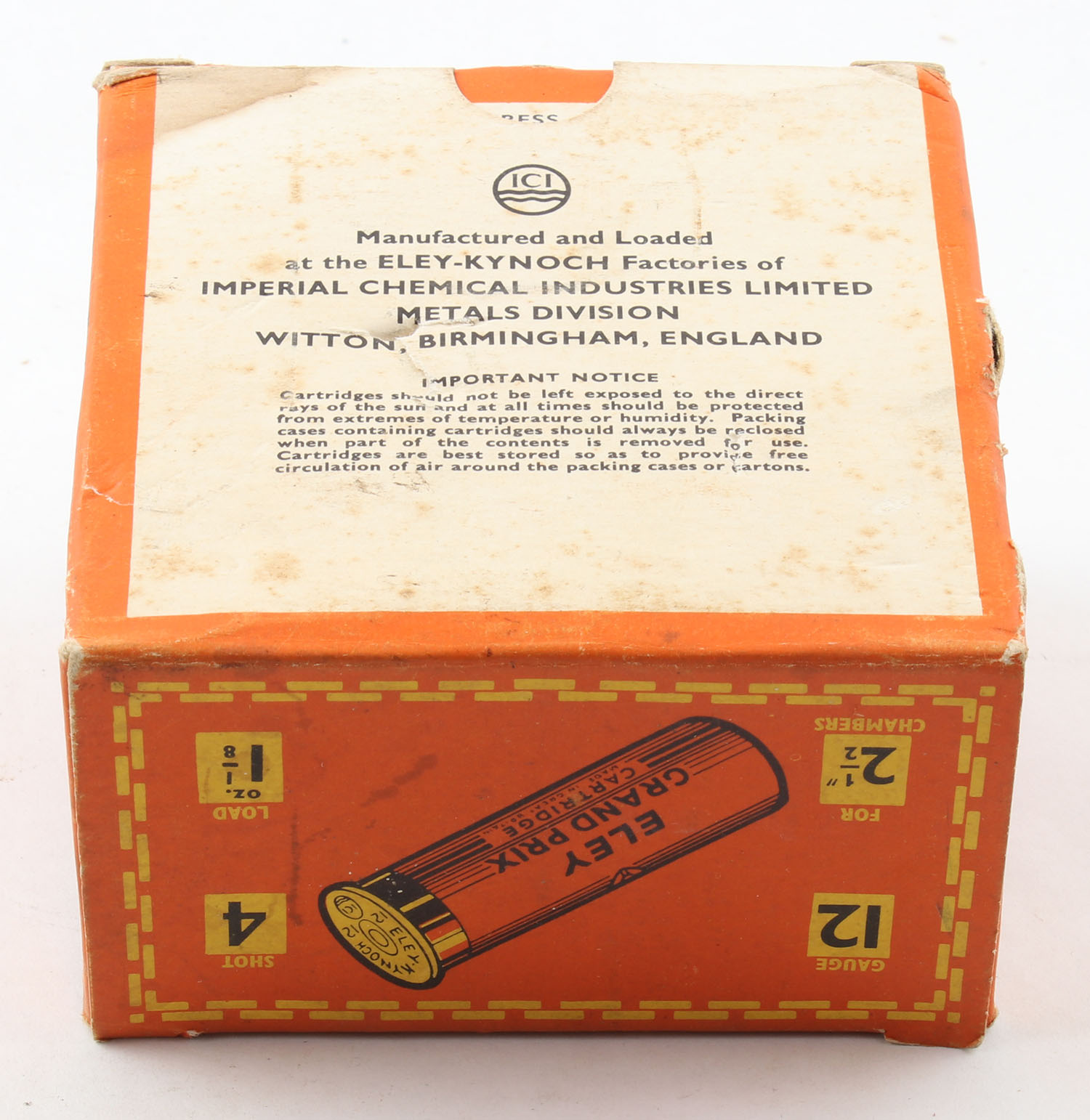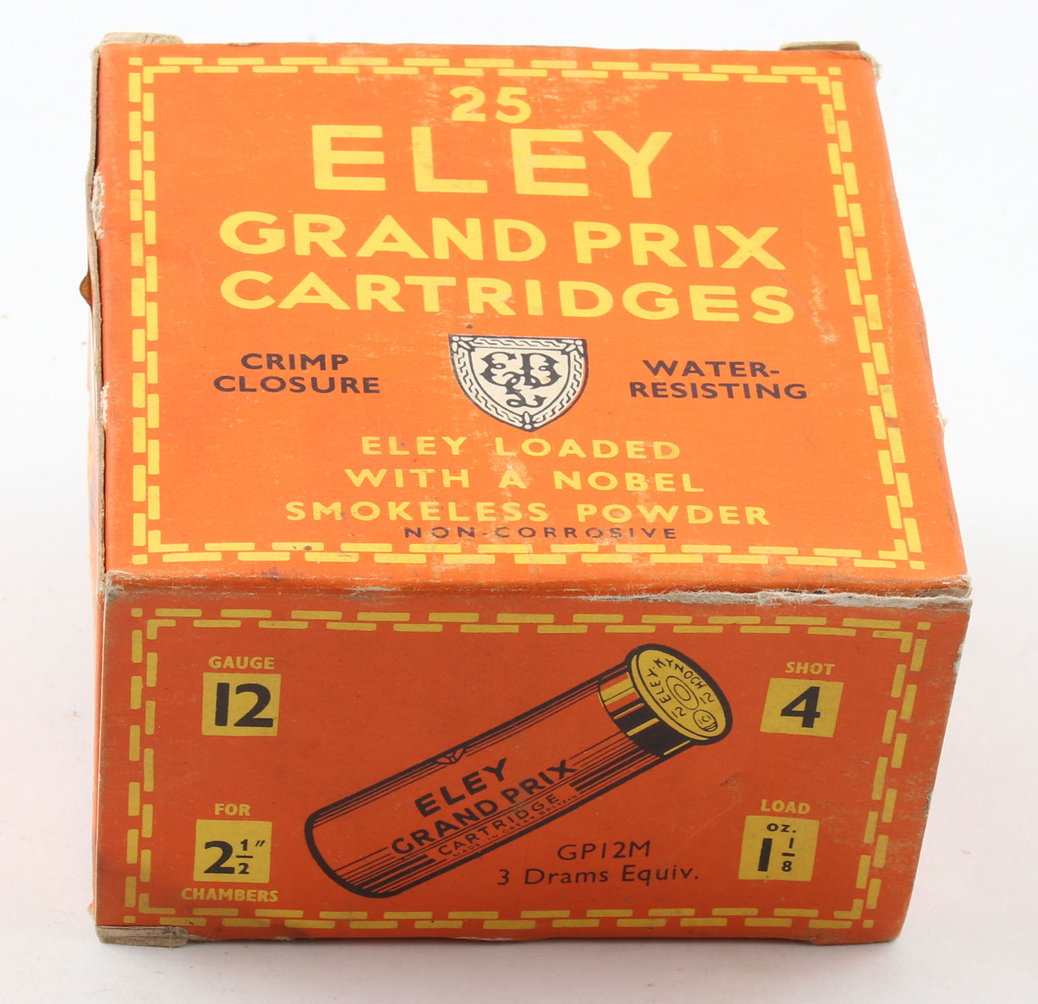 Eley, Grand Prix, 12ga., 1pc., Full, shot size 4, 2 1/2'', multi-colored box, box has scuffing with edge wear, paper shells are excellent. Grade: Very Good ++ - Value: 10 to 40