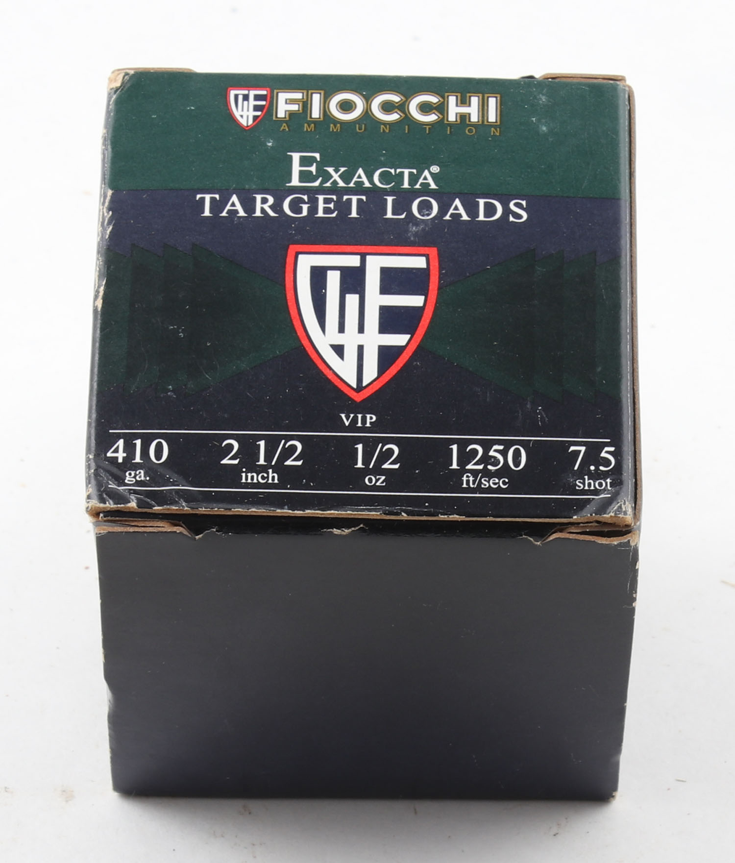 Fiocchi, Exacta Target Loads, 410ga., 1pc., Full, shot size 7 1/2, 2 1/2'', multi-colored box, box is very solid with excellent color, plastic shells are excellent. Grade: Excellent - Value: 10 to 50