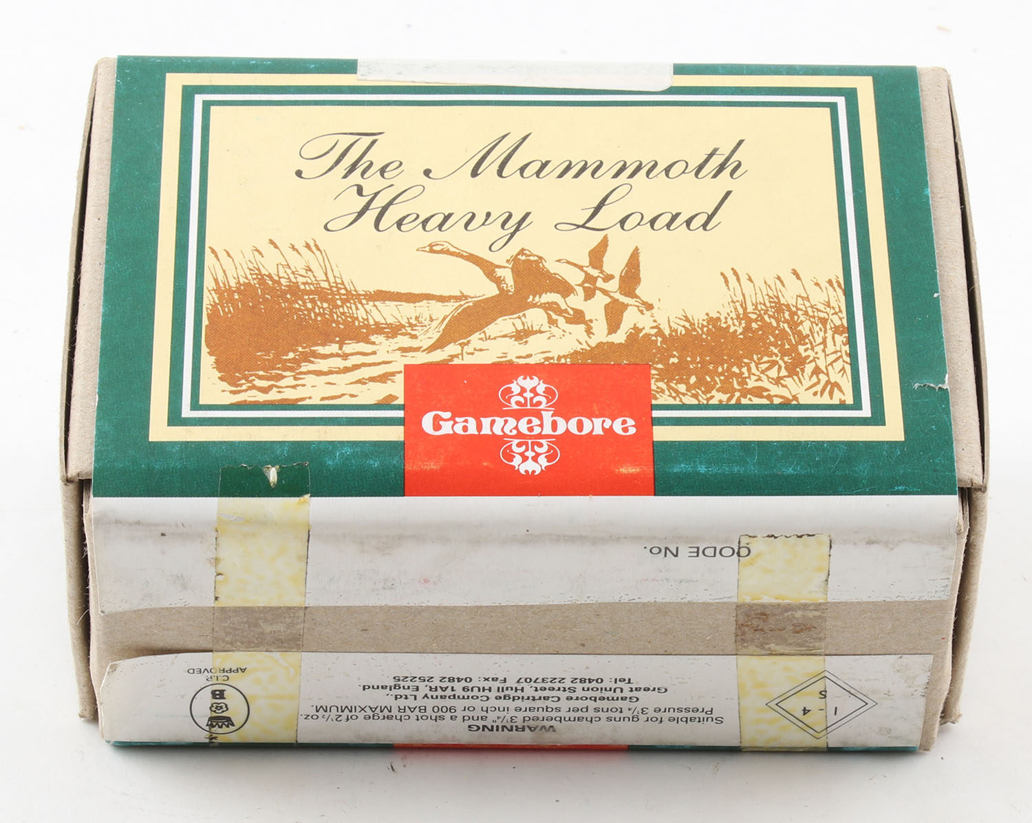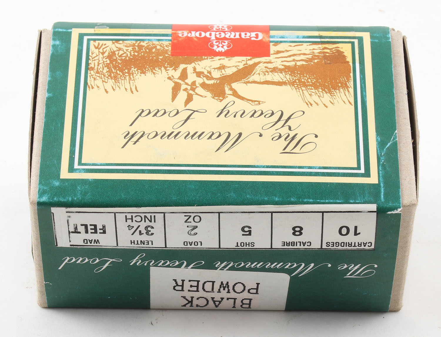 Gamebore, The Mammoth Heavy Load, 8ga., 2pc., Full & Sealed, shot size 5, 3 1/4'', Black Powder, buff box with multi-colored label, box and label are very solid. Grade: Excellent ++ - Value: 40 to 100