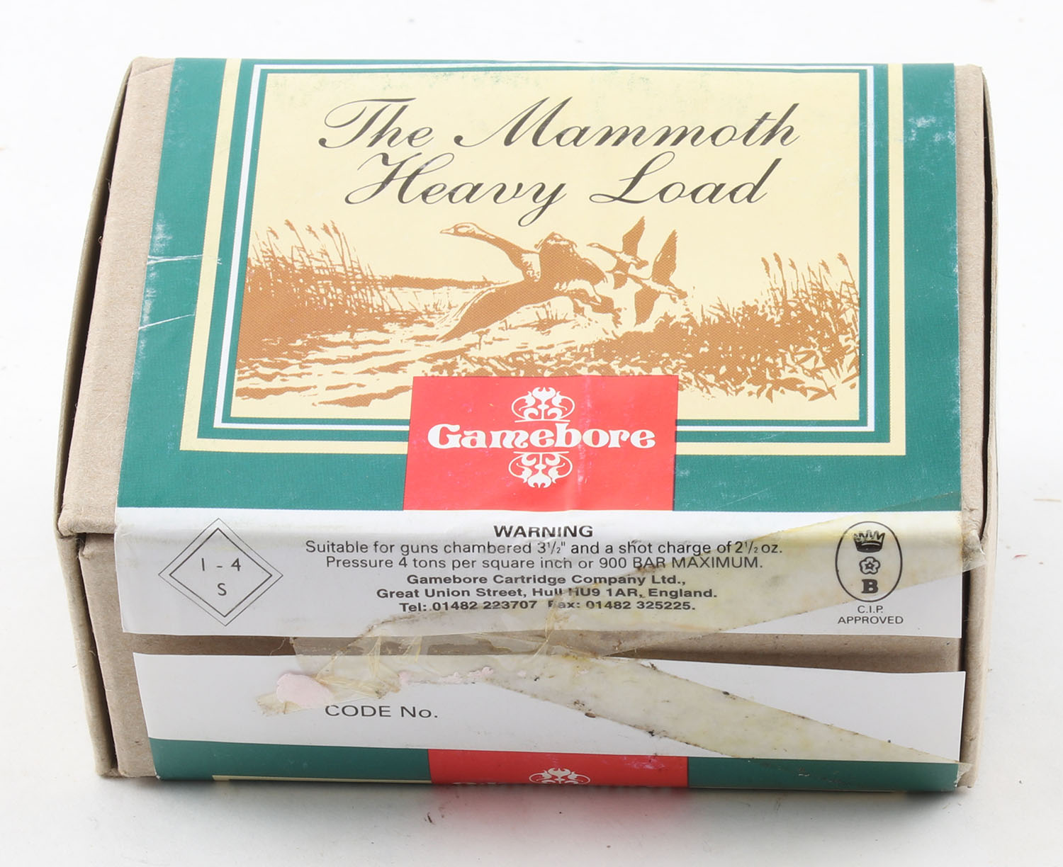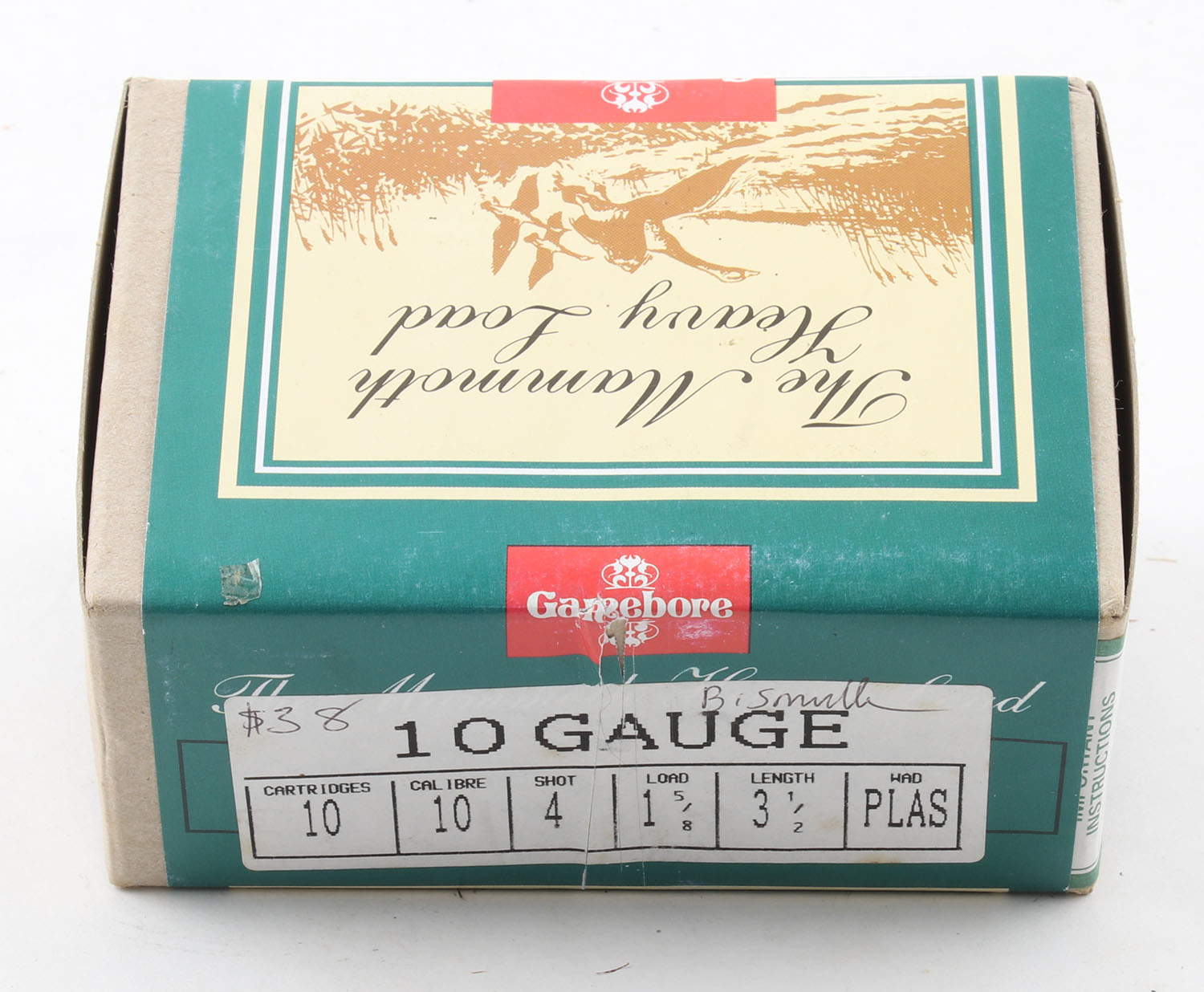 Gamebore, The Mammoth Heavy Load, 10ga., 2pc., Full, shot size 4, buff box with multi-colored label, box is very solid, plastic shells are very good. Grade: Excellent - Value: 20 to 50