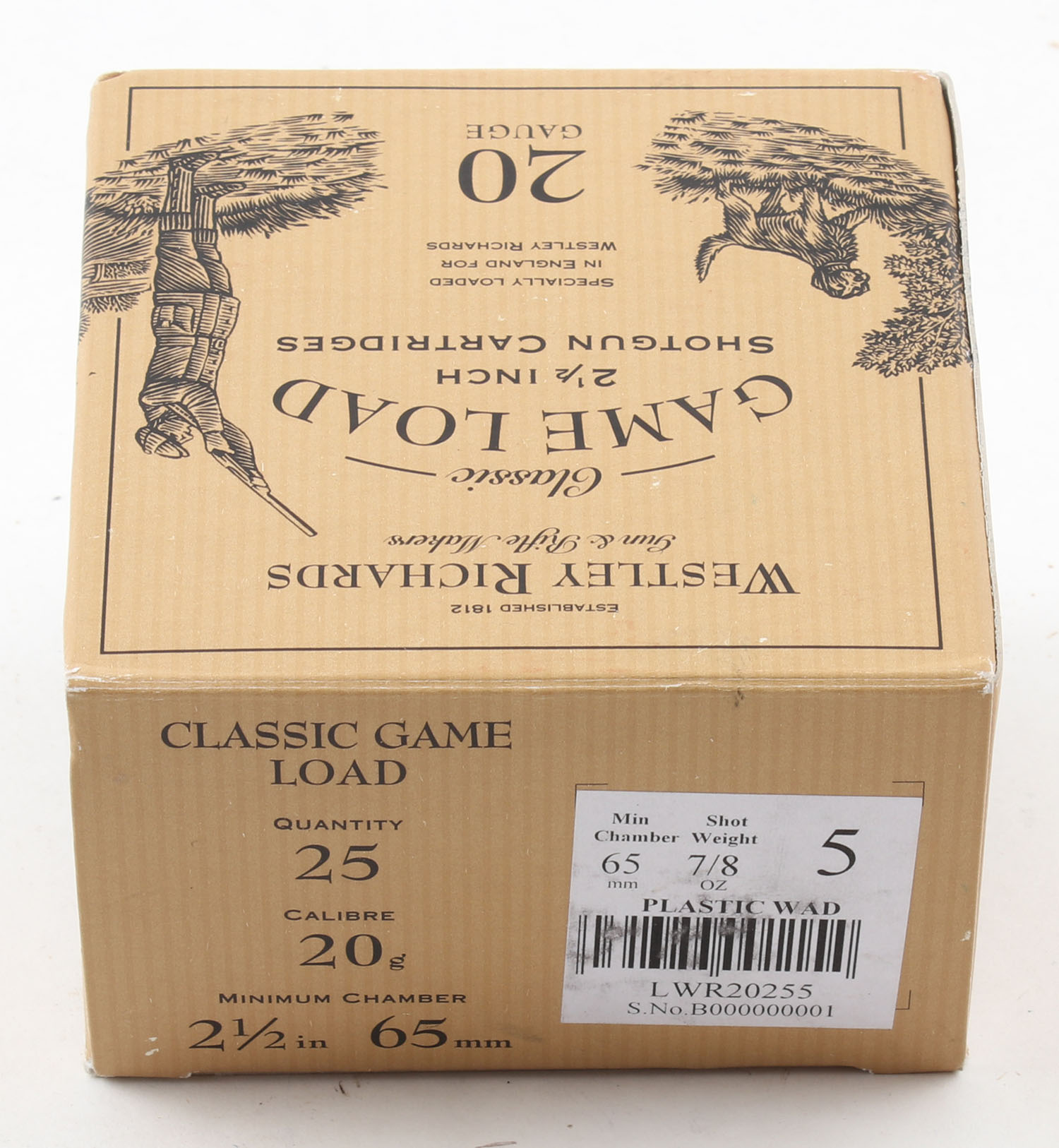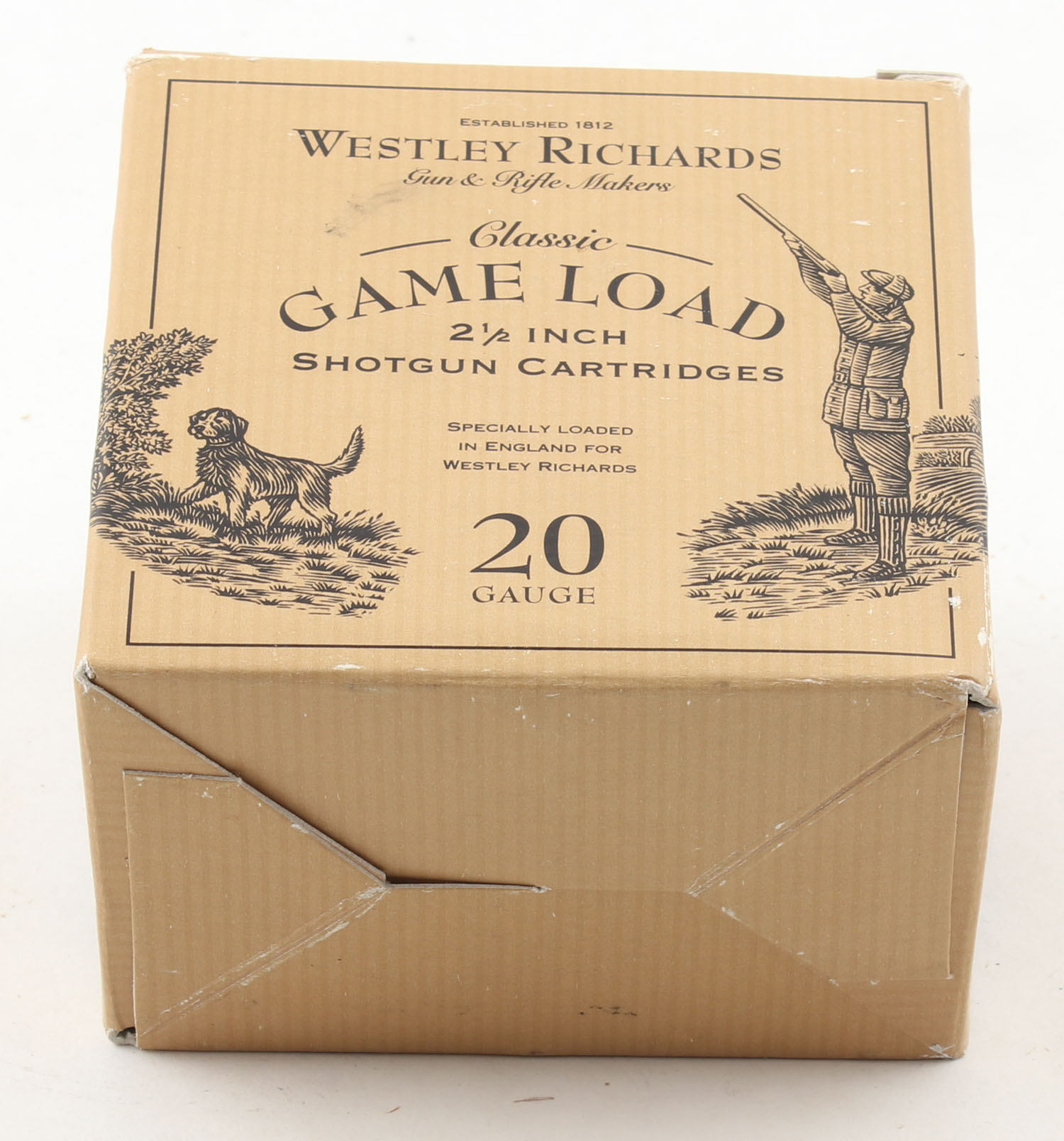 Westley Richards, Game Load, 20ga., Full, shot size 5, 2 1/2'', multi-colored box, box is very solid with excellent color, plastic shells are excellent. Grade: Excellent - Value: 10 to 40