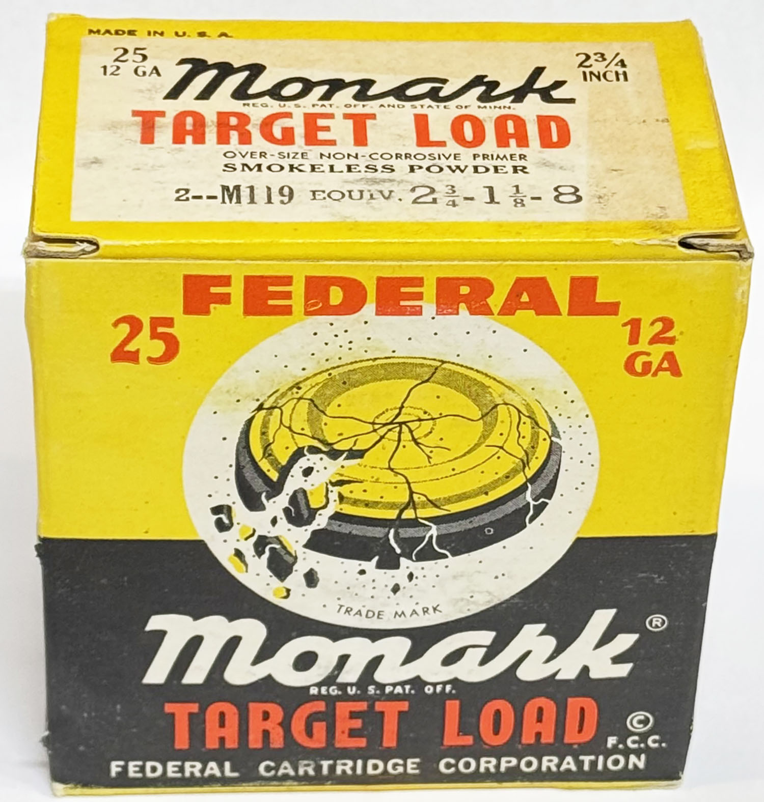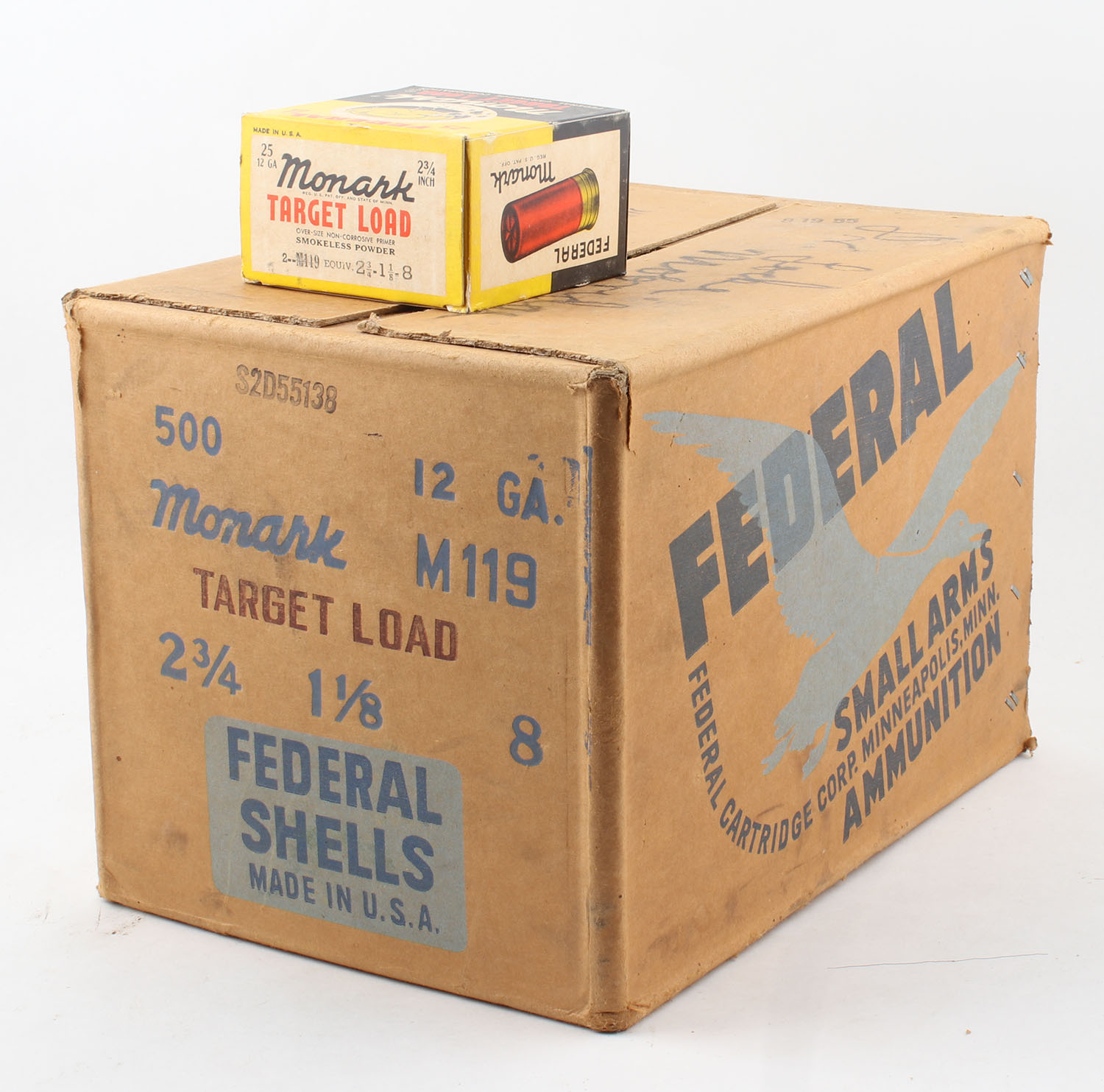 FULL CASE of FEDERAL, Monark, Target Load, 12ga., 1pc., FULL 500 rds., shot size 8, 2 3/4'', case is very solid & comes with original Insert, inside boxes are very solid with excellent color, paper shells are excellent. Grade: Excellent ++ - Value: 200 to 400