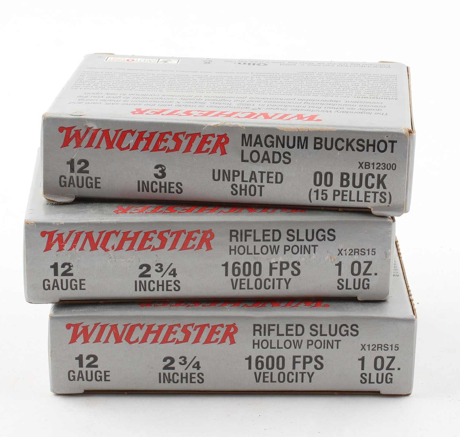 Lot of 3 Winchester, 12ga., 1pc., Appears Full, shot size Rifled Slug & 00 BUCK, multi-colored boxes. Grade: Excellent - Value: 10 to 20