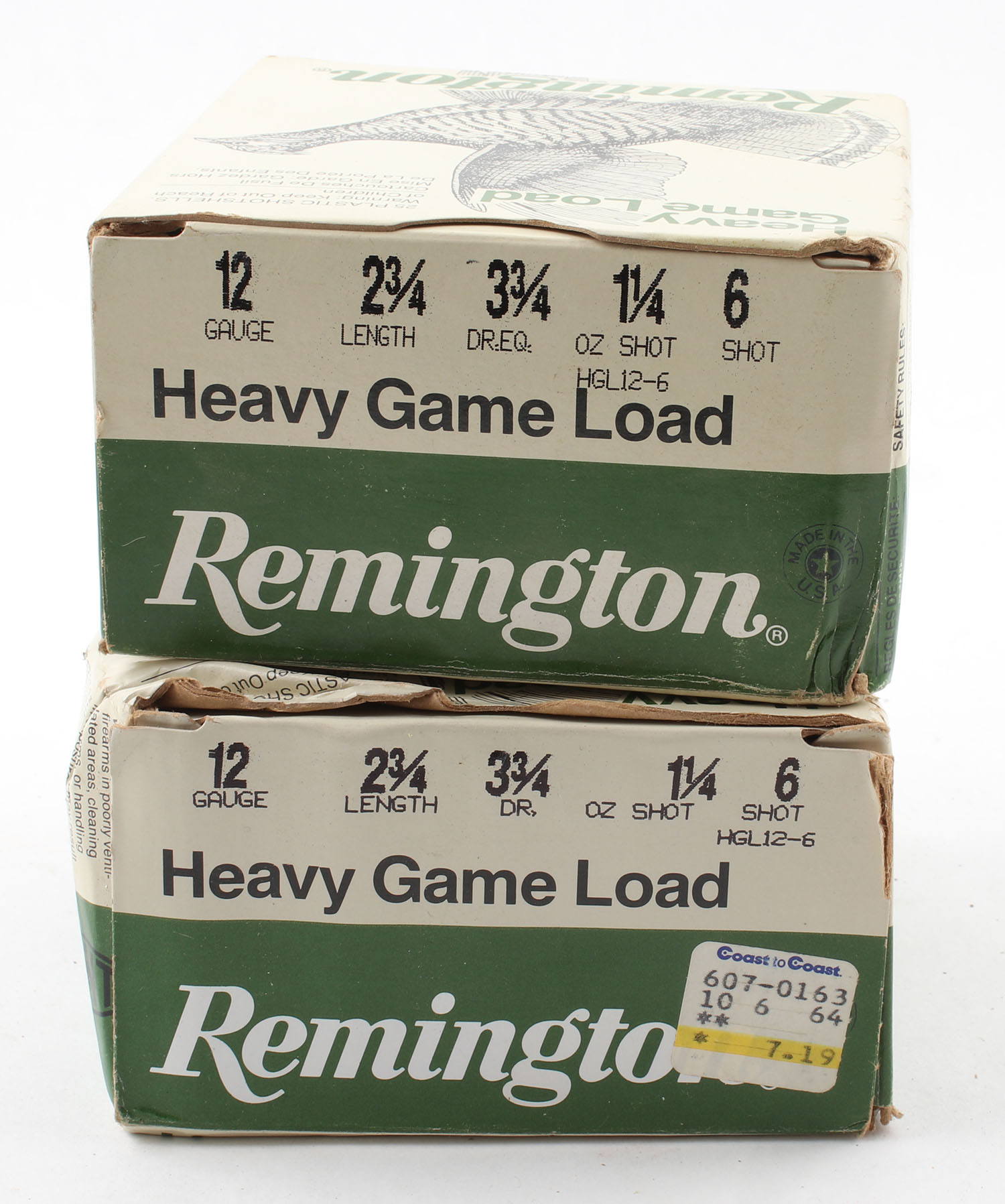 Lot of 2 Remington, 12ga., 1pc., Appears Full, shot size 6, multi-colored boxes. Grade: Very Good - Value: 10 to 40