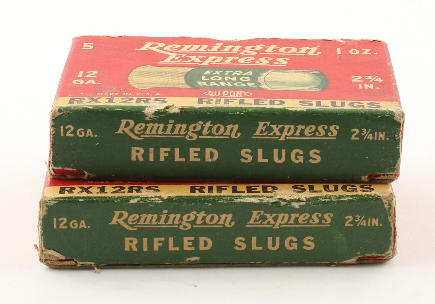 Lot of 2 Remington, 12ga., 1pc., Appears Full, shot size Rifled Slugs, multi-colored boxes. Grade: Very Good - Value: 8 to 20