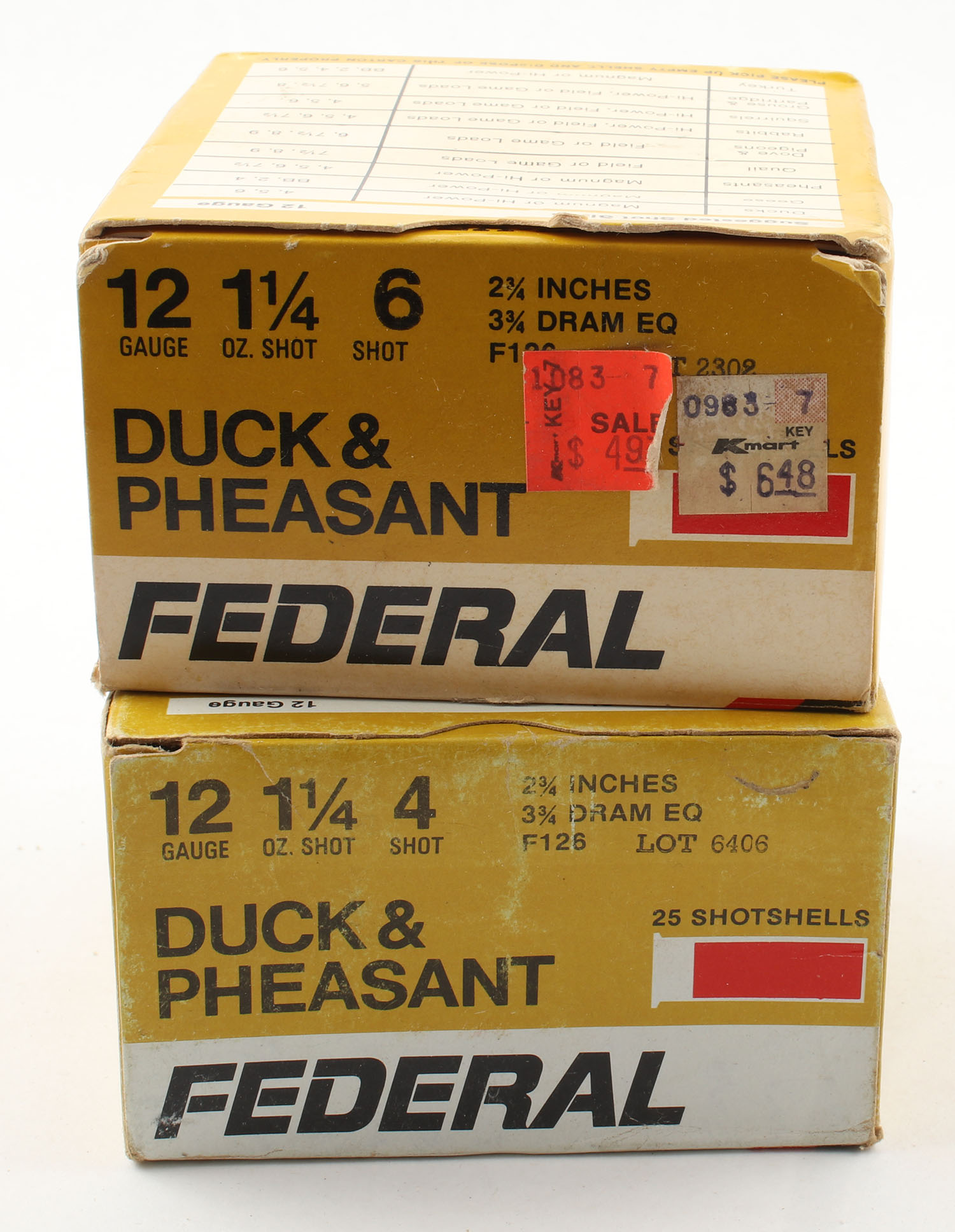 Lot of 2 Federal, 12ga., 1pc., Appears Full, shot size 6 & 4, multi-colored boxes. Grade: Very Good ++ - Value: 10 to 40