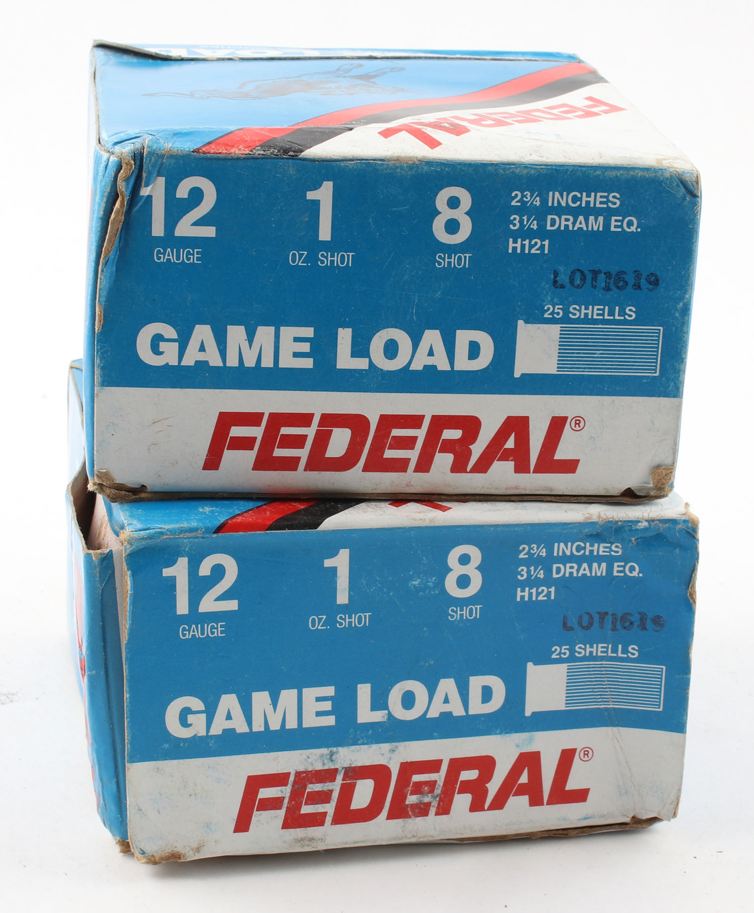Lot of 2 Federal, 12ga., 1pc., Appears Full, shot size 8, multi-colored boxes. Grade: Very Good - Value: 10 to 40