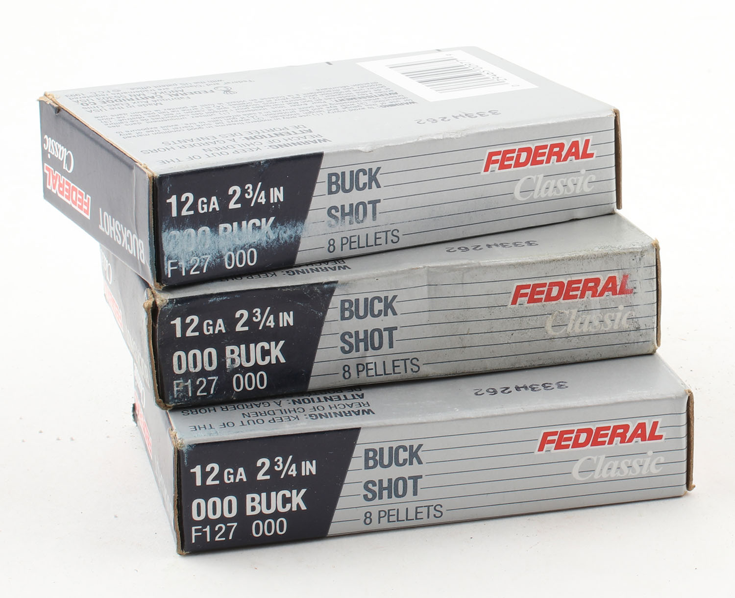 Lot of 3 Federal, 12ga., 1pc., Appears Full, shot size 000BUCK, multi-colored boxes. Grade: Excellent + - Value: 10 to 30