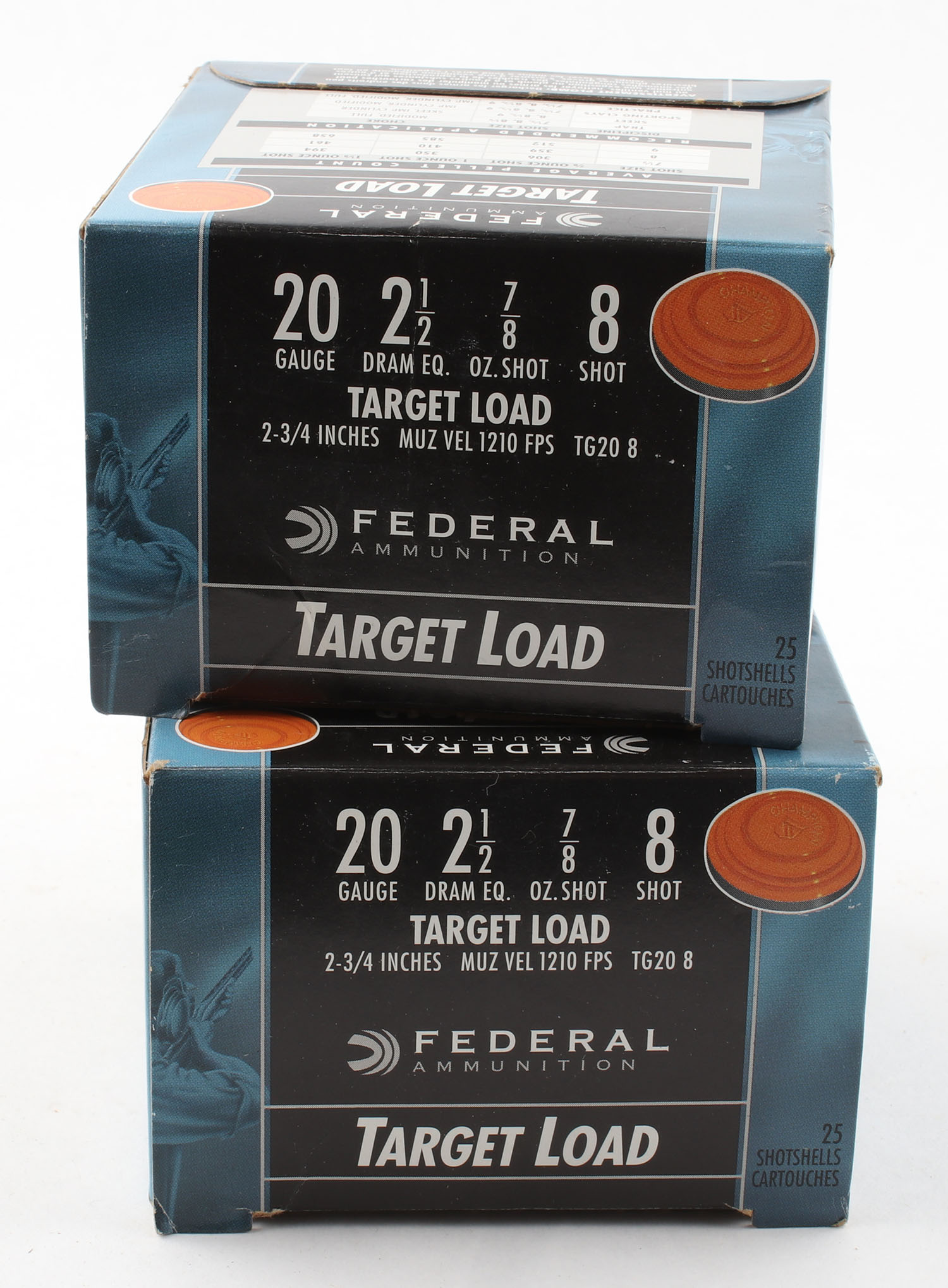 Lot of 2 Federal, 20ga., 1pc., Appears Full, shot size 8, multi-colored boxes. Grade: Excellent + - Value: 10 to 40