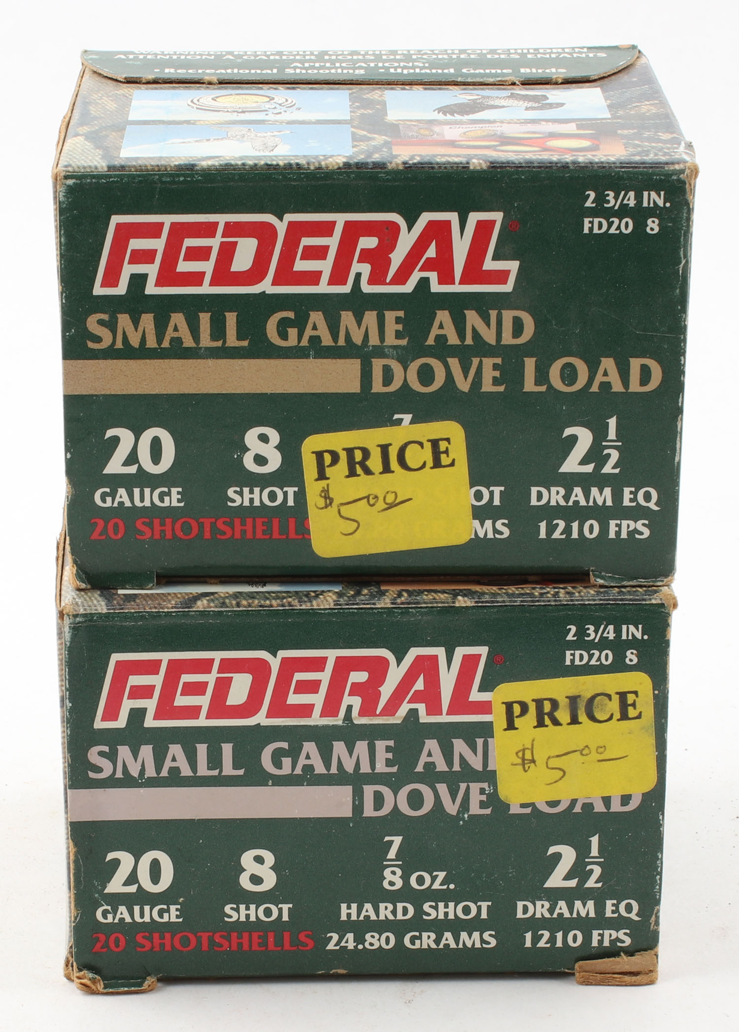 Lot of 2 Federal, 20ga., 1pc., Appears Full, shot size 8, multi-colored boxes. Grade: Excellent - Value: 10 to 40