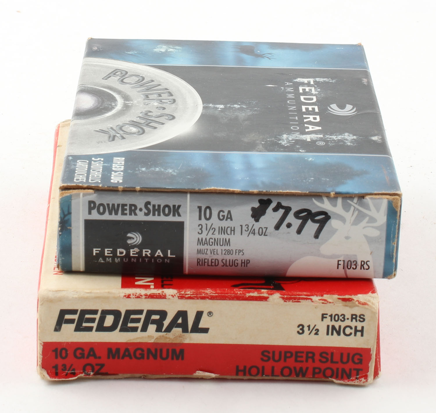 Lot of 2 Federal, 10ga., 1pc., Appears Full, 3 1/2'', shot size Rifled Slug & Super Slug Magnum, multi-colored boxes. Grade: Very Good + - Value: 20 to 60