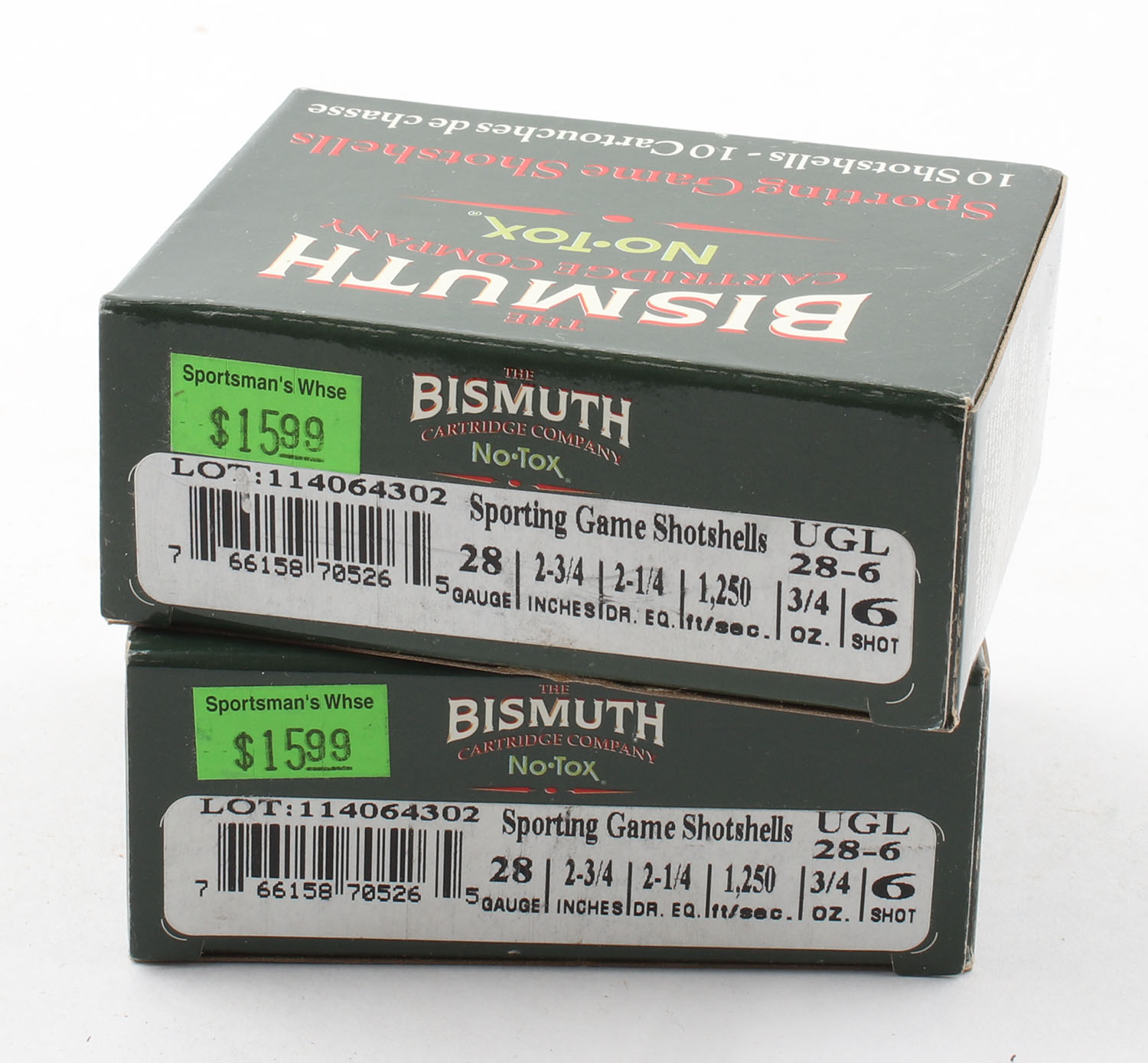 Lot of 2 Bismuth, 28ga., 1pc., Appears Full, shot size 6, 2 3/4'', multi-colored boxes. Grade: MINT - Value: 10 to 40