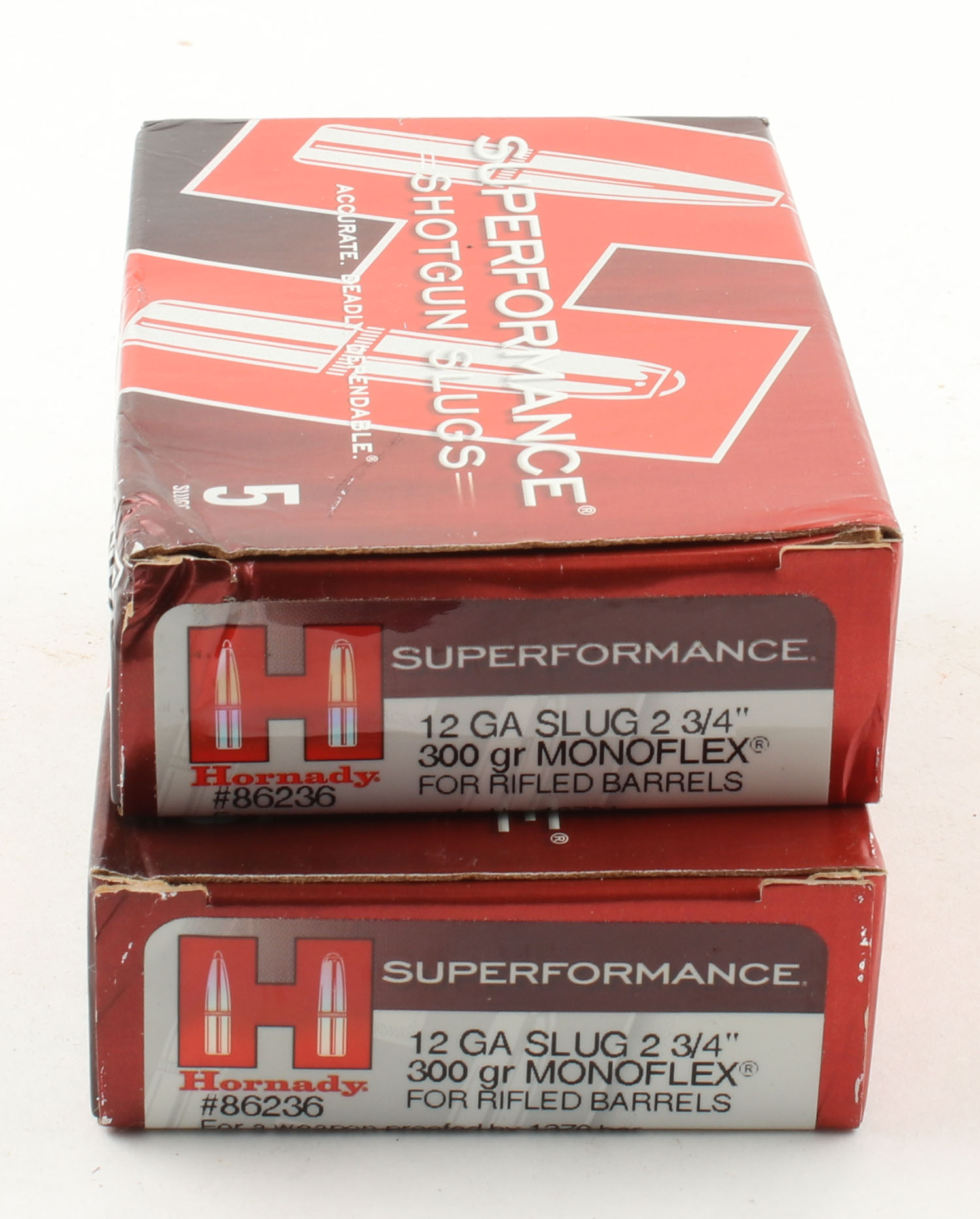 Lot of 2 Hornady, 12ga., 1pc., Appears Full, shot size Performance Slug, multi-colored boxes. Grade: Excellent - Value: 8 to 30