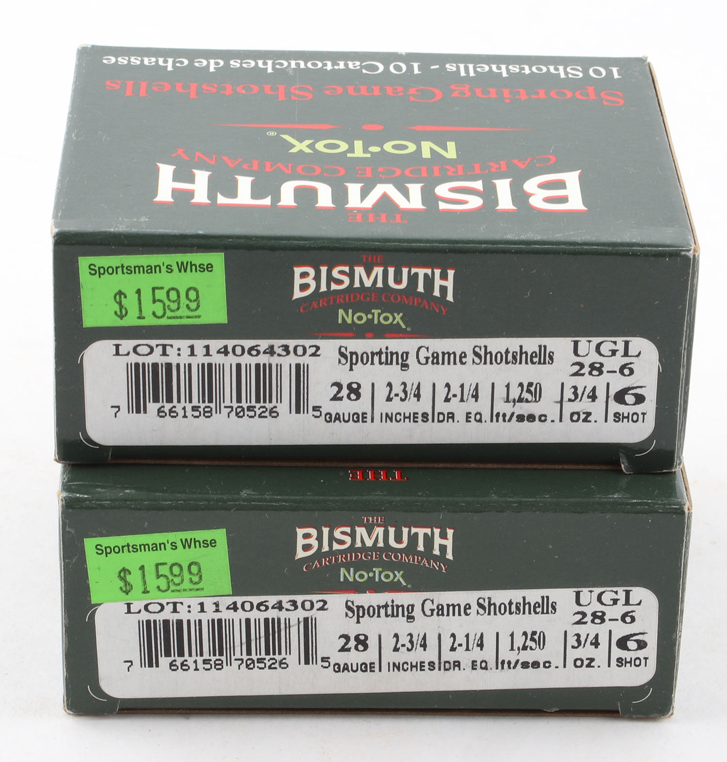 Lot of 2 Bismuth, 28ga., Appears Full, shot size 6, multi-colored boxes. Grade: Excellent ++ - Value: 10 to 50