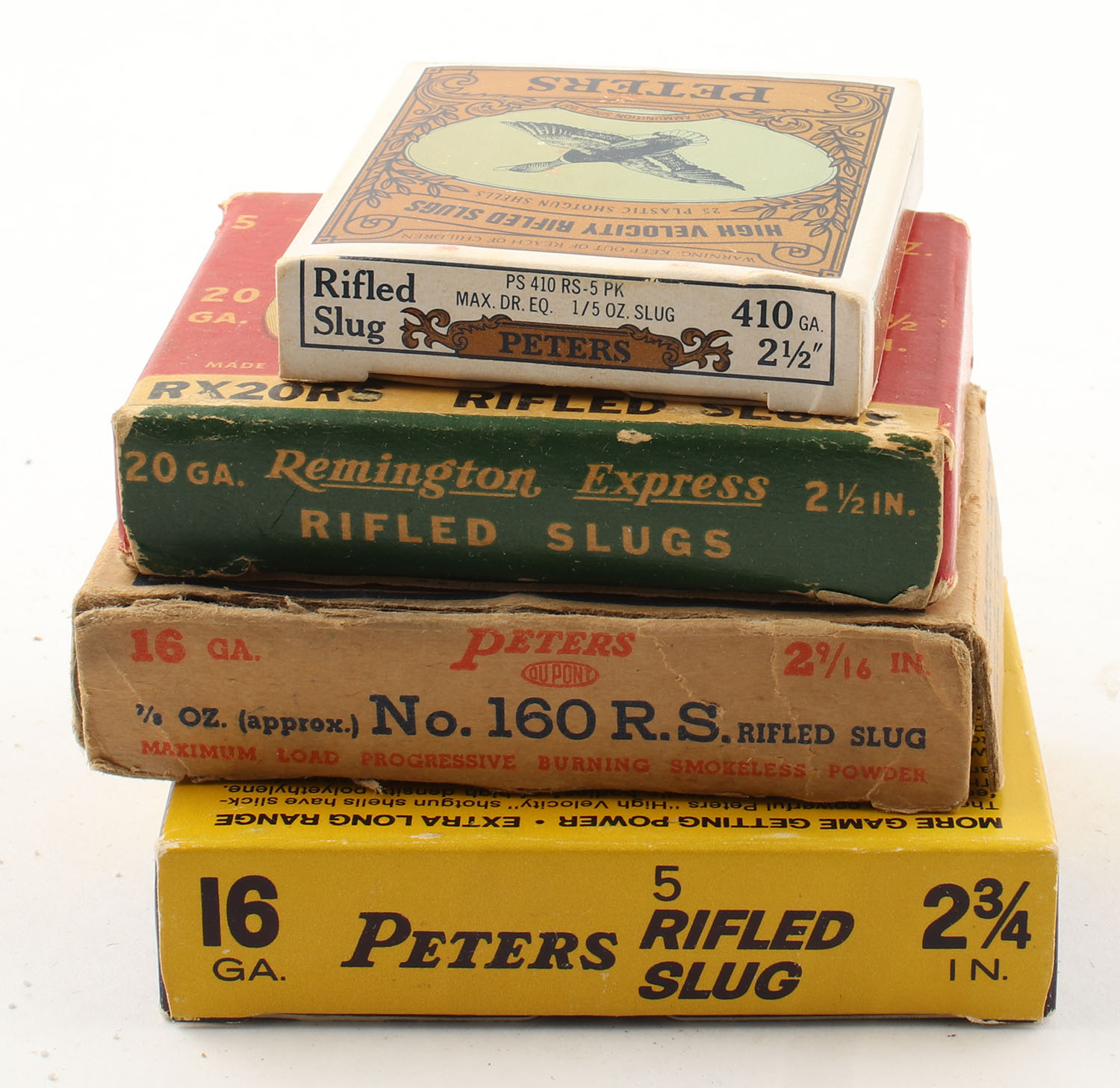 Lot of 4, Mixed Manufacture, 16/20/410ga., Appears Full, shot size Rifled Slug, Shotshell boxes. Grade: Very Good - Value: 8 to 30