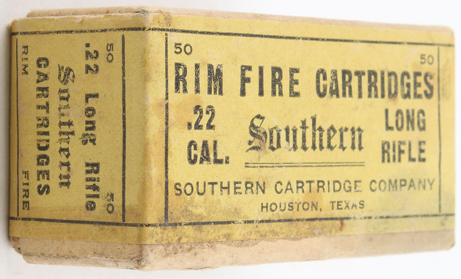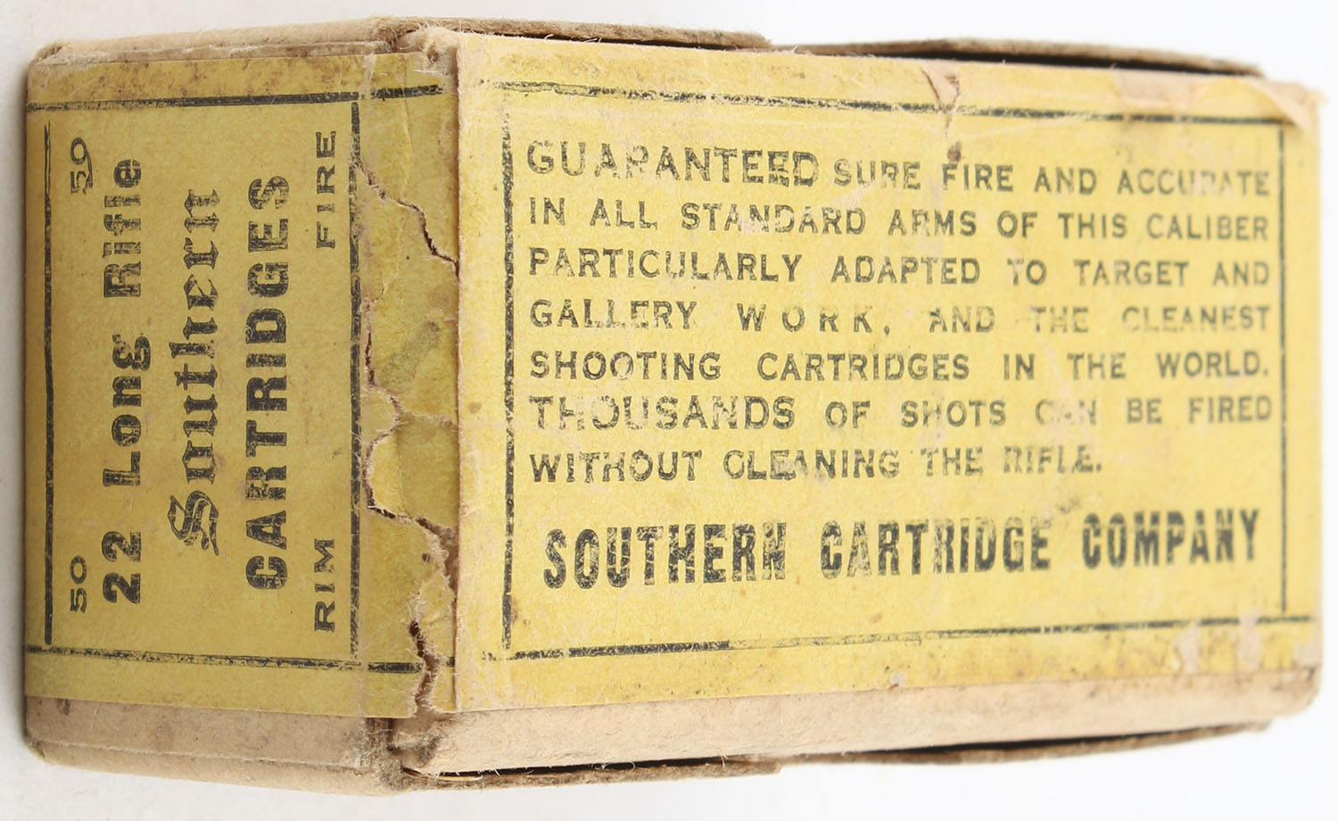 Southern, Rim Fire Cartridges, .22 Long Rifle, RHWeb: SOUTH-1 LR-1, FULL & SEALED, 2pc. Buff box with yellow & black wraparound label, box is solid with good to very good color, some staining & age soiling, minor edge & corner wear, label is intact, seal partially torn on right end. Grade: Very Good - Value: 500 to 750