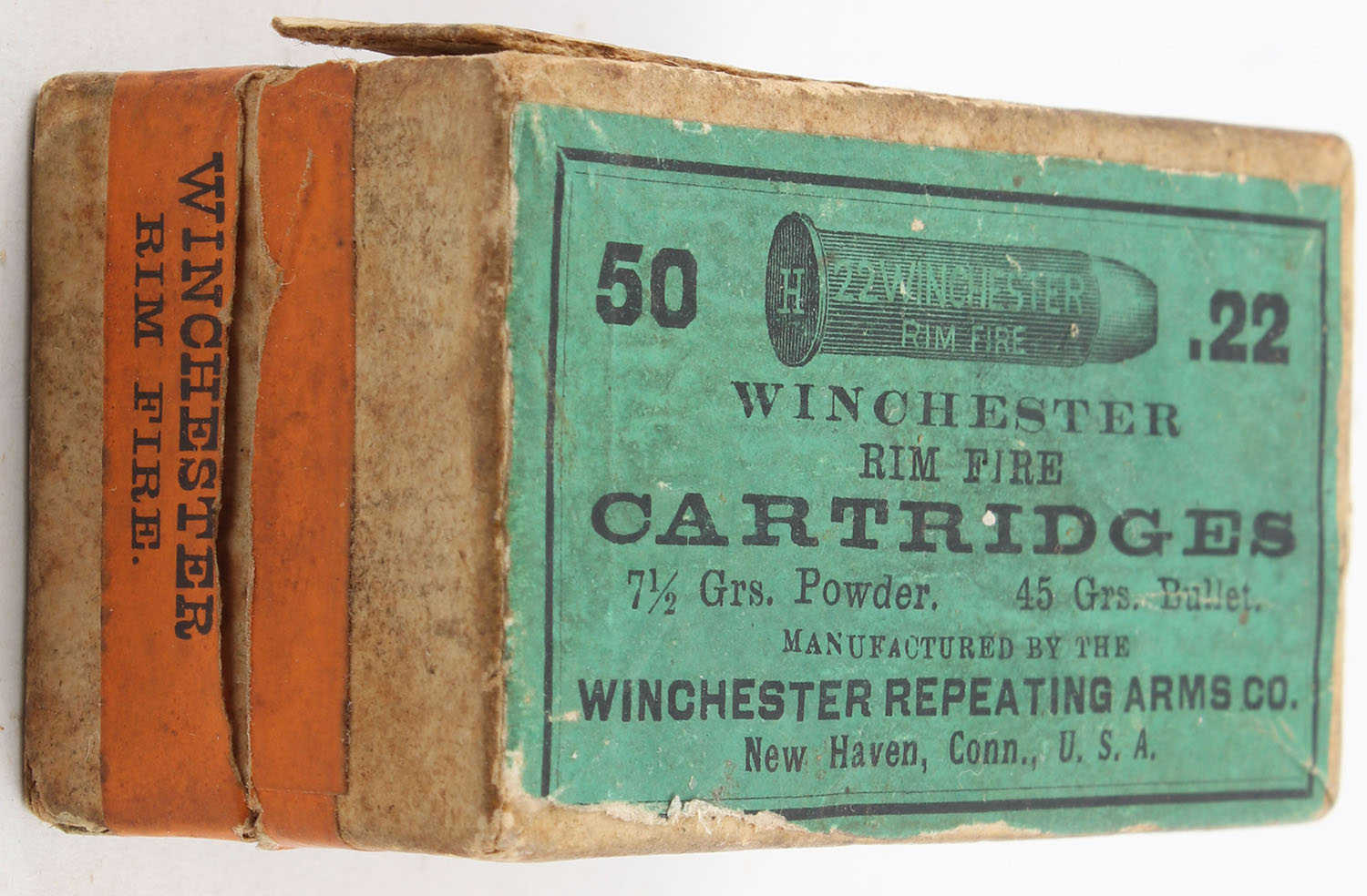 Winchester, Rim Fire Cartridges, .22 Winchester Rim Fire, RR: WRA-149 WRF-1a, Partial 48rds., 2pc. Buff box with green top & orange side sealing labels, box is solid with very good color, some age soiling, minor edge & corner wear, labels are intact, ammo is excellent. Grade: Very Good ++ - Value: 40 to 60