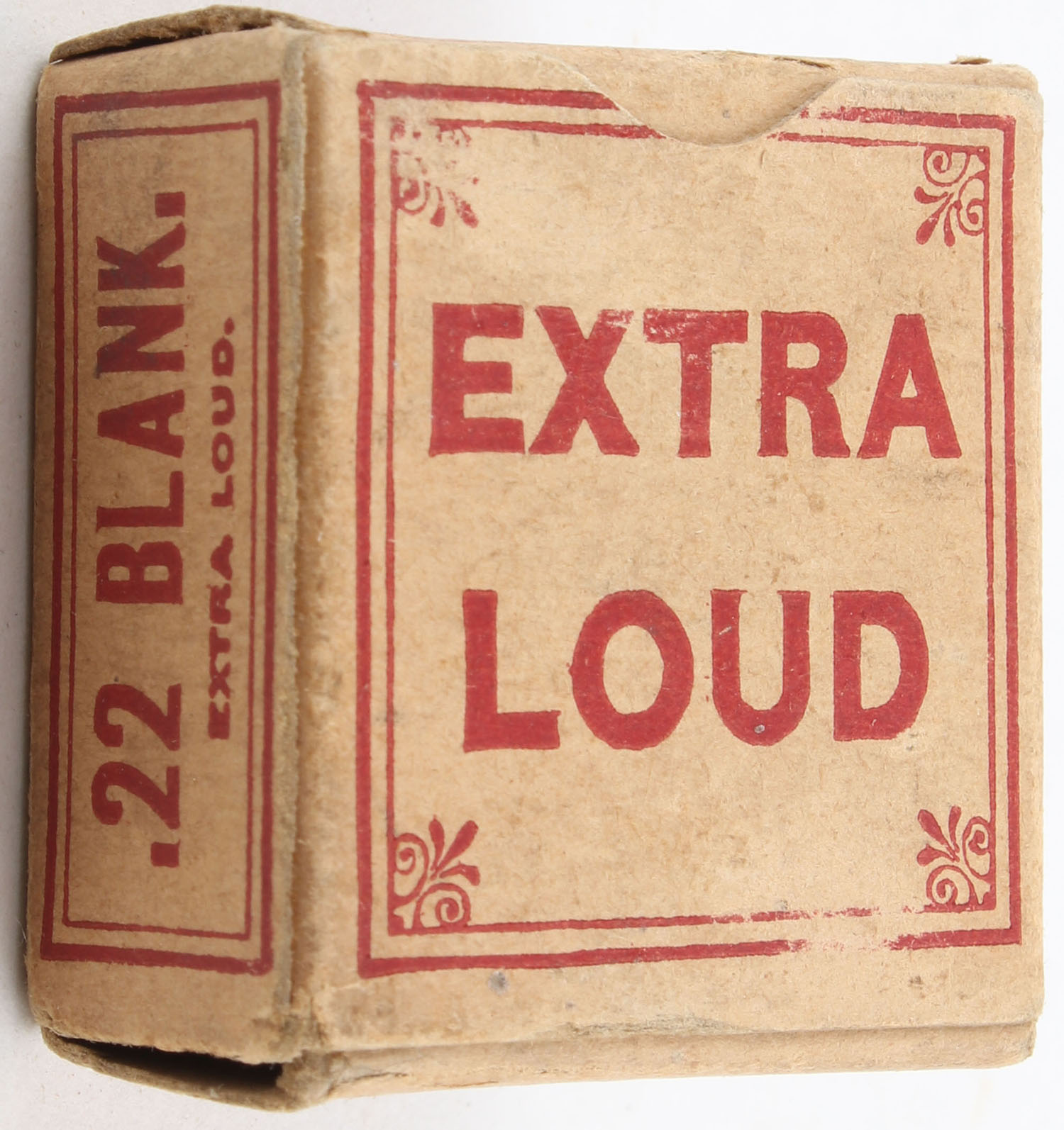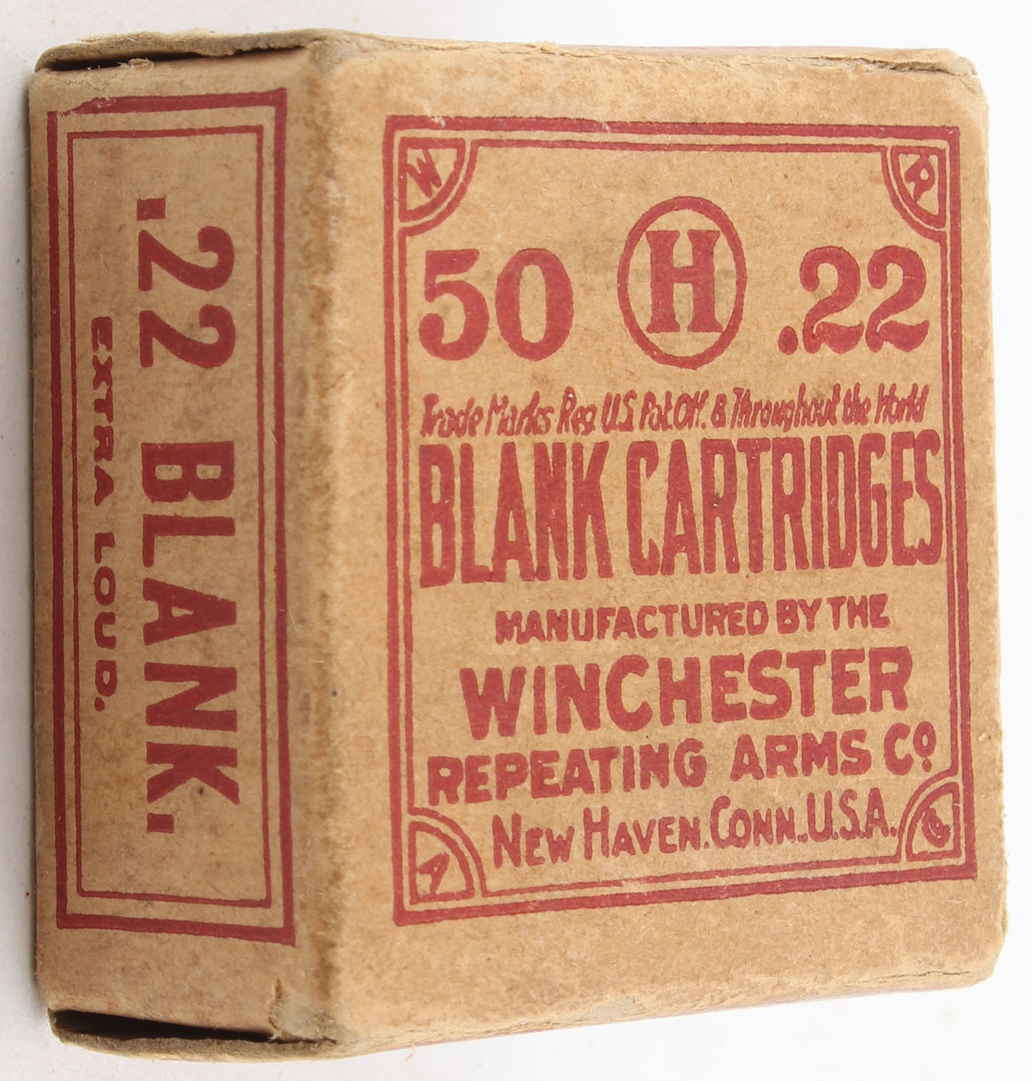 Winchester, Blank Cartridges, .22 Short, RR: WRA-21 SB-7c, Full, 1pc. Buff box with red printing, box is solid with excellent color, minor age soiling, minor edge & corner wear, end flaps are solid, ammo is excellent. Grade: Very Good ++ - Value: 20 to 40