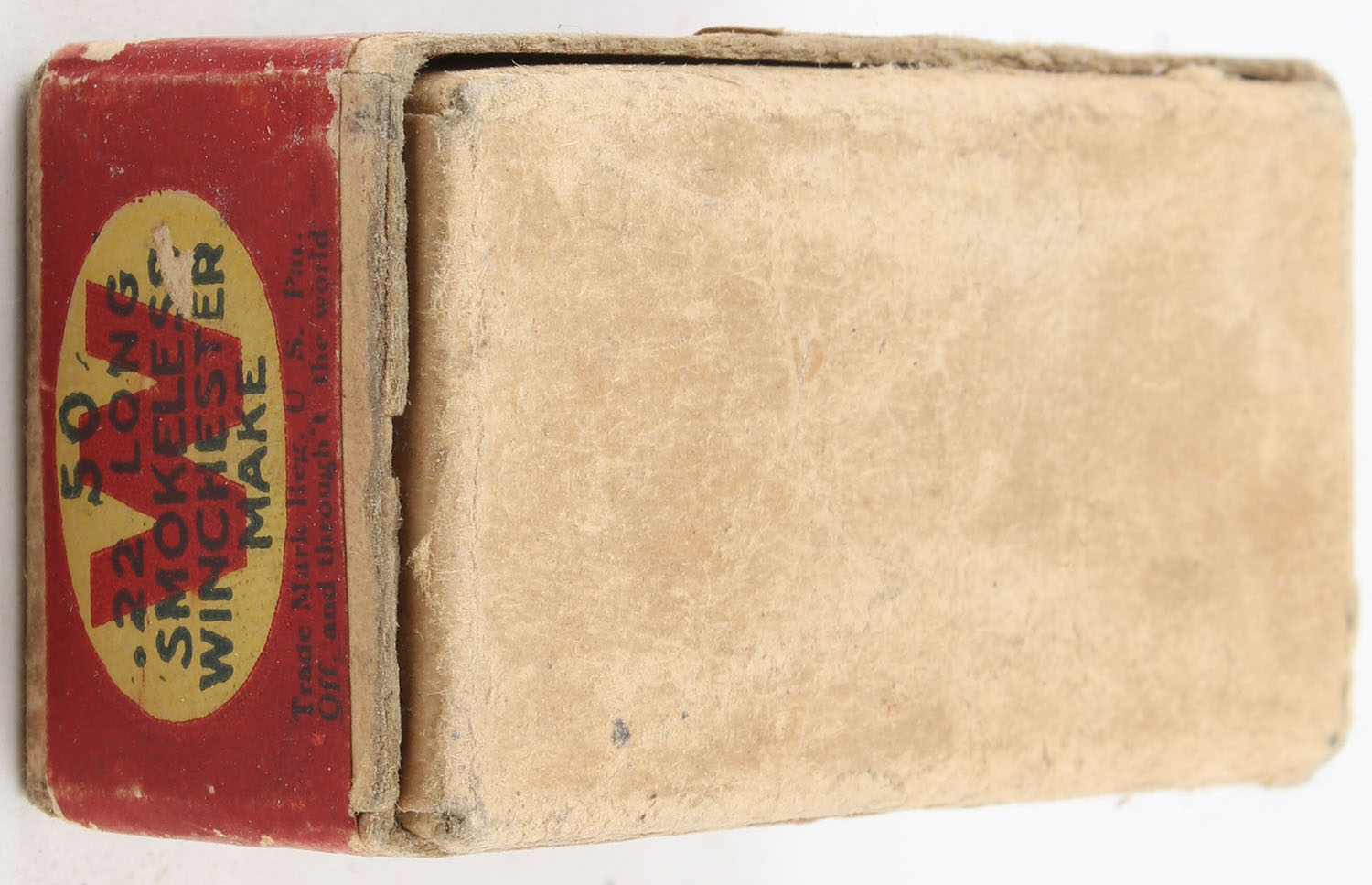 Winchester, Smokeless Rifle Cartridges, .22 Long, RR: WRA-65 L-24e, Empty, 2pc. Buff box with green top & red/yellow side sealing labels, box is solid with very good color, some age soiling, minor edge & corner wear, labels are intact. Grade: Very Good - Value: 16 to 40
