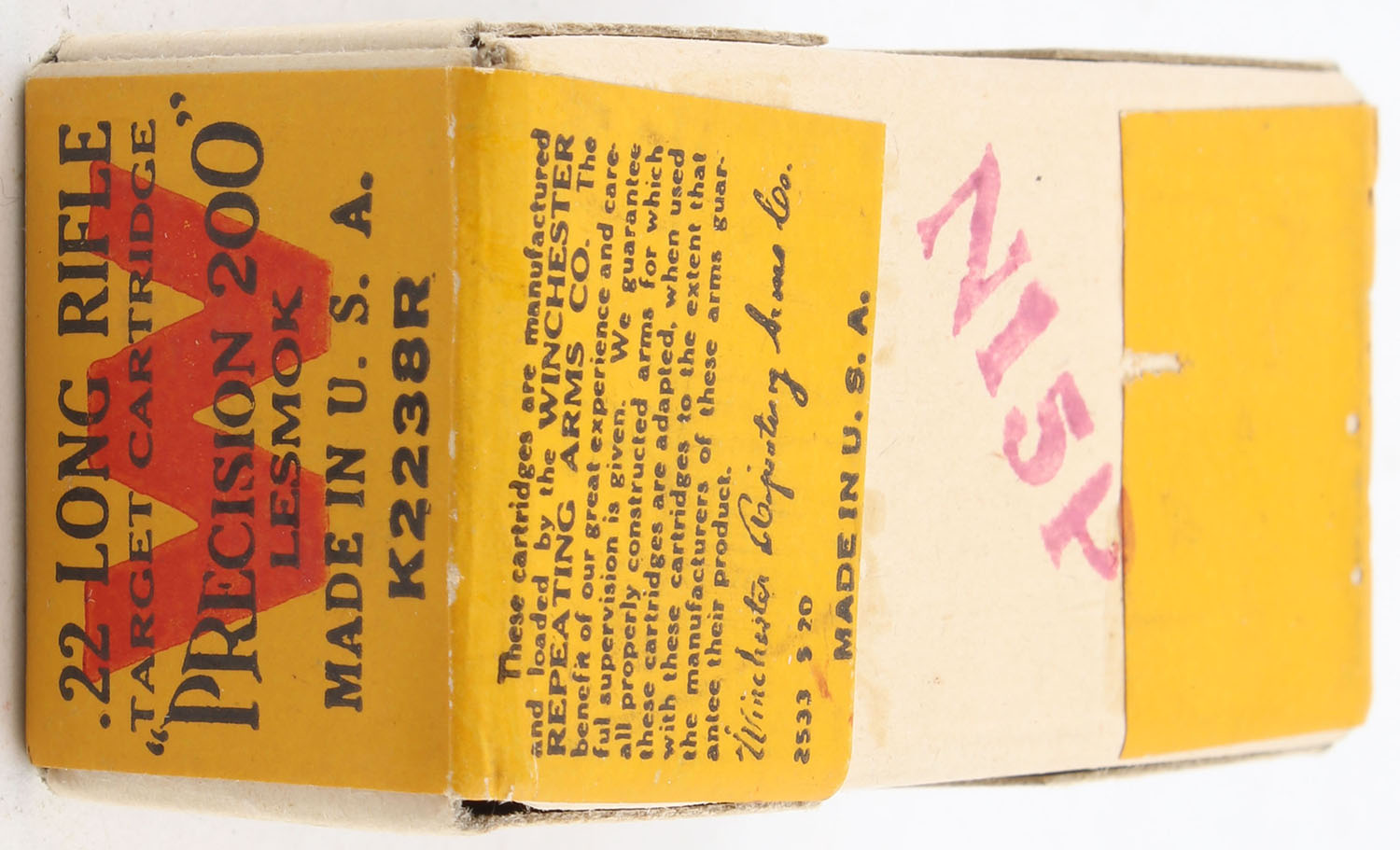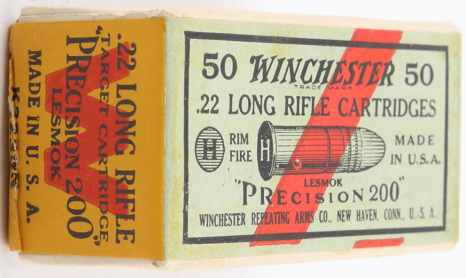 Winchester, ''Precision 200'', .22 Long Rifle, RR: WRA-129 LR-43c, FULL & SEALED, 2pc. Buff box with green yellow & red wraparound label, box is MINT with minty color, corners are sharp, edges are crisp, label is intact. Grade: MINT - Value: 140 to 210
