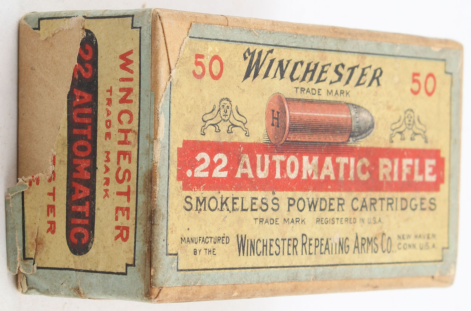 Winchester, Smokeless Powder Cartridges, .22 Automatic, Double Lion Label, RR:WRA-167 WA-1a, FULL & SEALED, 2pc. Buff box with yellow top & side sealing labels, box is solid with very good color, some age soiling, very minor edge & corner wear, labels are 99% intact. Grade: Very Good ++ - Value: 400 to 1200