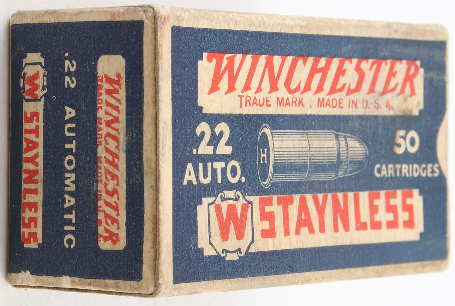 Winchester, Staynless, .22 Automatic, RHWeb: WRA-12B WA-1B, Full, 1pc. Blue white & red box, box is solid with very good to excellent color, minor age soiling & shelf wear, very minor corner wear, edges are mostly crisp, end flaps are solid, ammo is excellent. Grade: Excellent - Value: 50 to 75