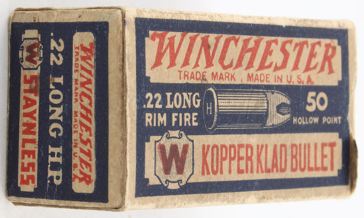 Winchester, Kopper Klad Bullet, .22 Long Hollow Point, RHWeb: WRA-12.5 L-2a, Partial 42rds. 1pc. Blue white & red box, box is solid with very good color, some age soiling, minor edge & corner wear, end flaps are solid, ammo is excellent. Grade: Very Good ++ - Value: 100 to 150